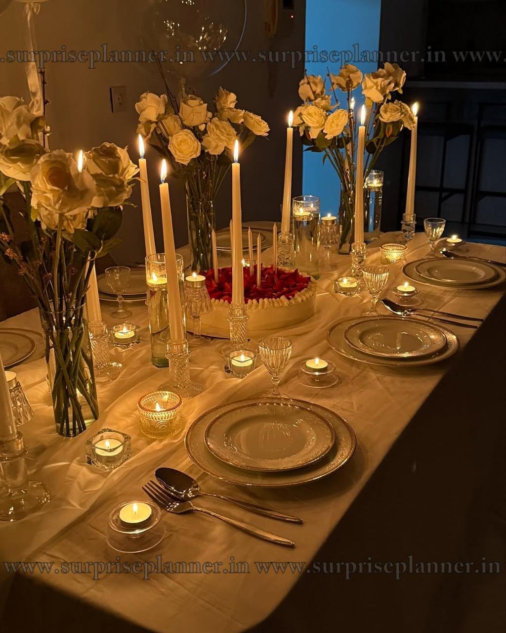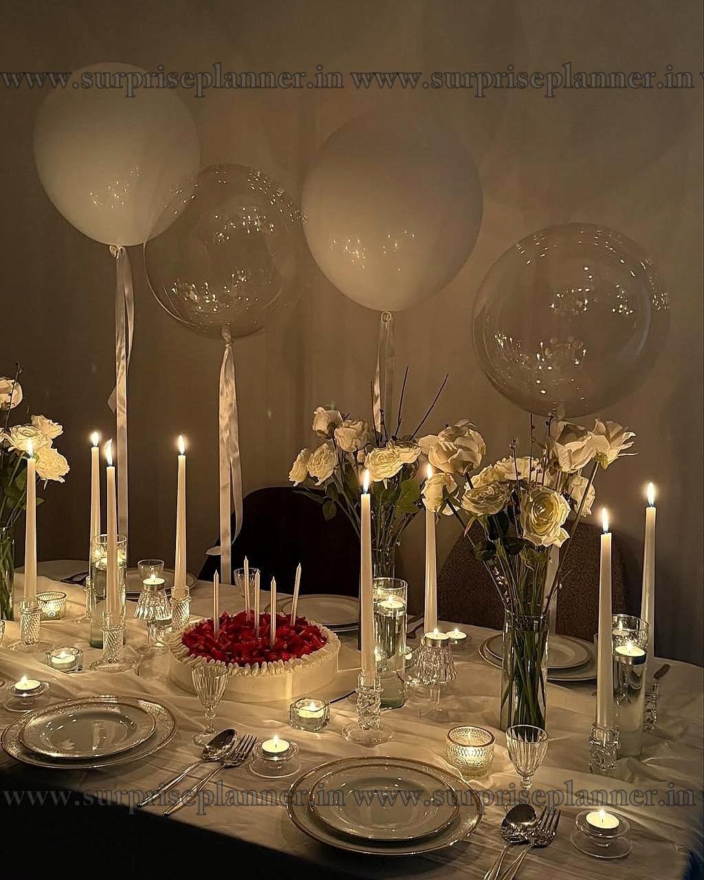 This elegant candlelight dinner setup is the perfect choice for a romantic celebration or a special occasion. The table is beautifully adorned with fresh white and cream roses in tall glass vases, soft candlelight from taper and tealight candles, and a luxurious cream tablecloth that enhances the warm, intimate ambiance. At the center, a stunning cake topped with strawberries adds a delicious touch of sweetness. Transparent balloons with white ribbons float above, adding a whimsical and celebratory flair. Each place setting is carefully arranged with classic white plates, silver-rimmed chargers, and crystal glassware, offering a fine dining experience. The overall mood is cozy, classy, and full of love—ideal for anniversaries, proposals, or birthdays. Let us help you create magical memories with this unforgettable candlelight dinner experience.