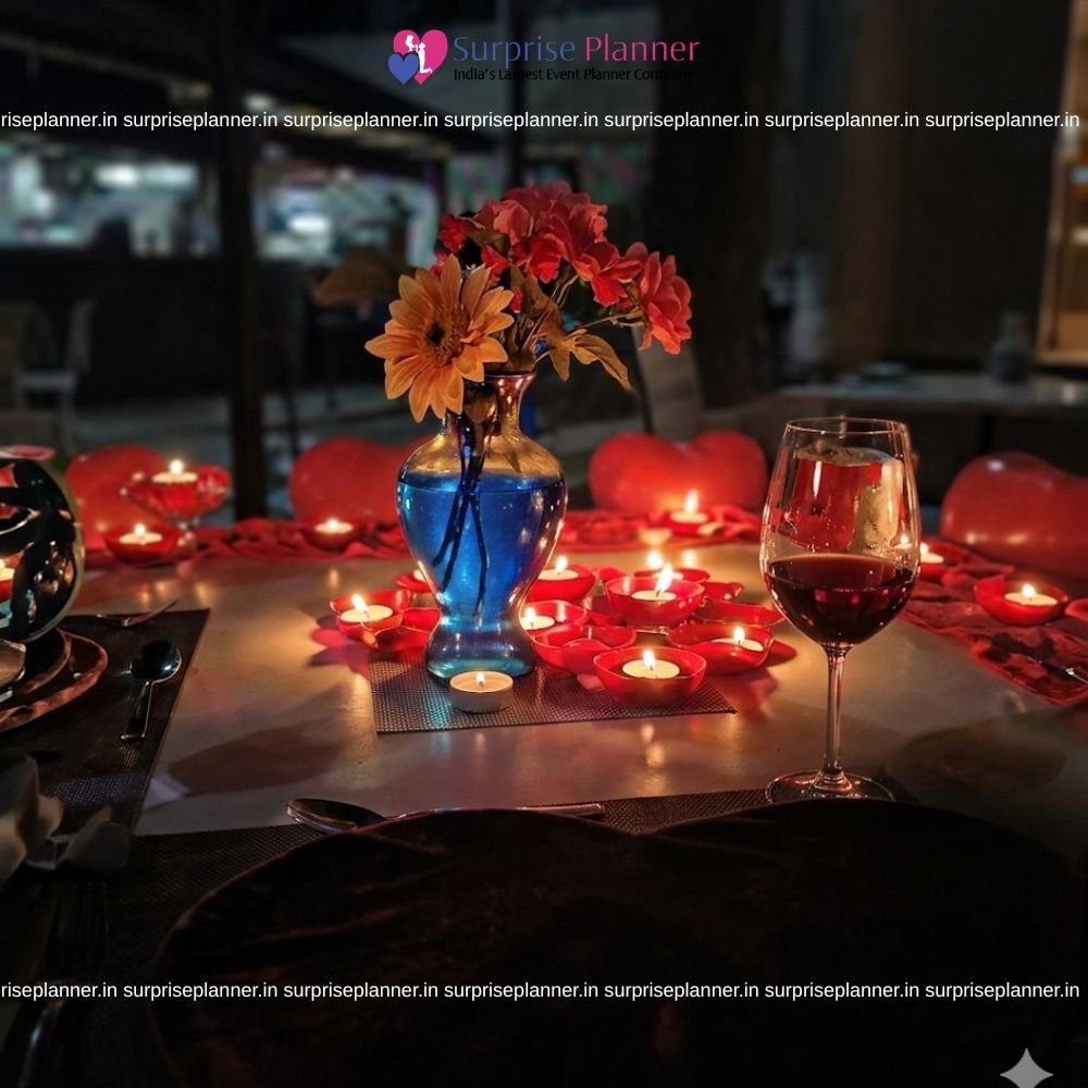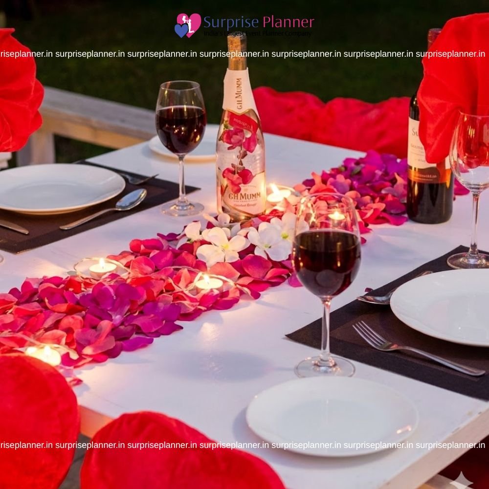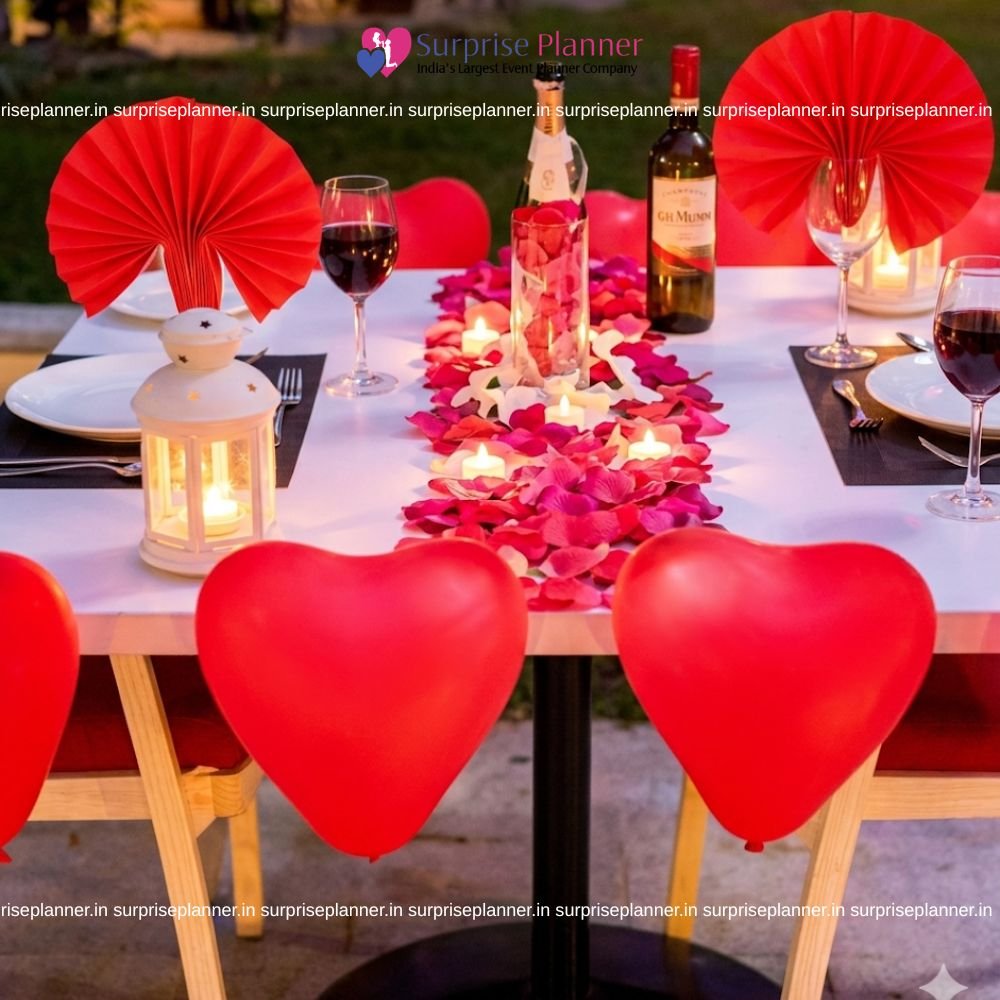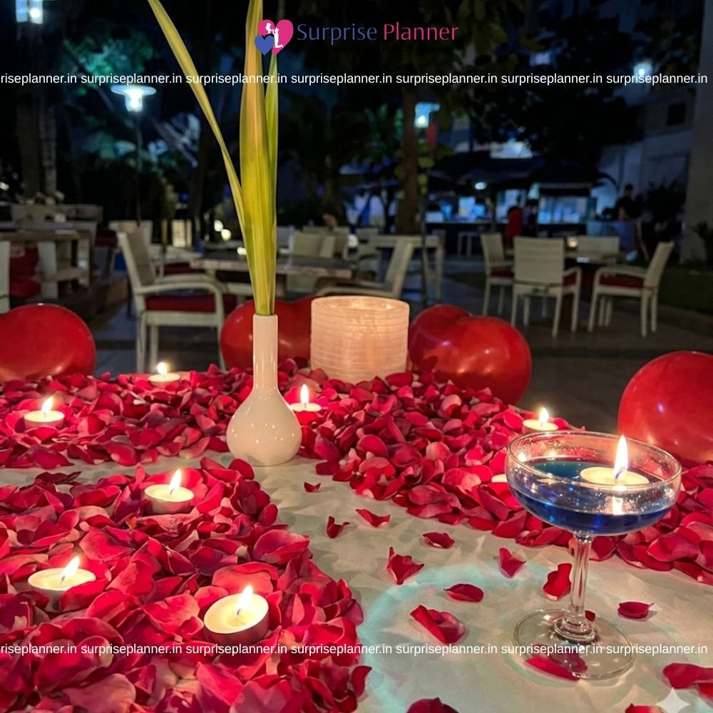 Enjoy a Romantic Garden Candlelight Dinner in Hyderabad, located in a peaceful and verdant garden environment. This intimate dining experience comprises tastefully placed tables surrounded by gentle lighting, fresh flowers, and burning tea candles, creating a dream-like environment. Enjoy exquisite meals created by famous chefs and suited to your preferences, accompanied by lovely music. Whether it's an anniversary, a special event, or simply a romantic evening, this arrangement provides a central location in Hyderabad as well as a sumptuous hideaway, making your night absolutely unique.