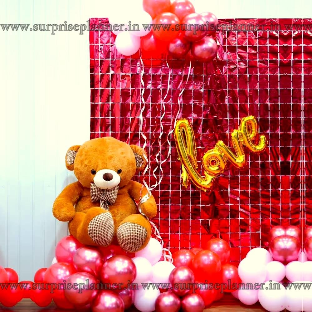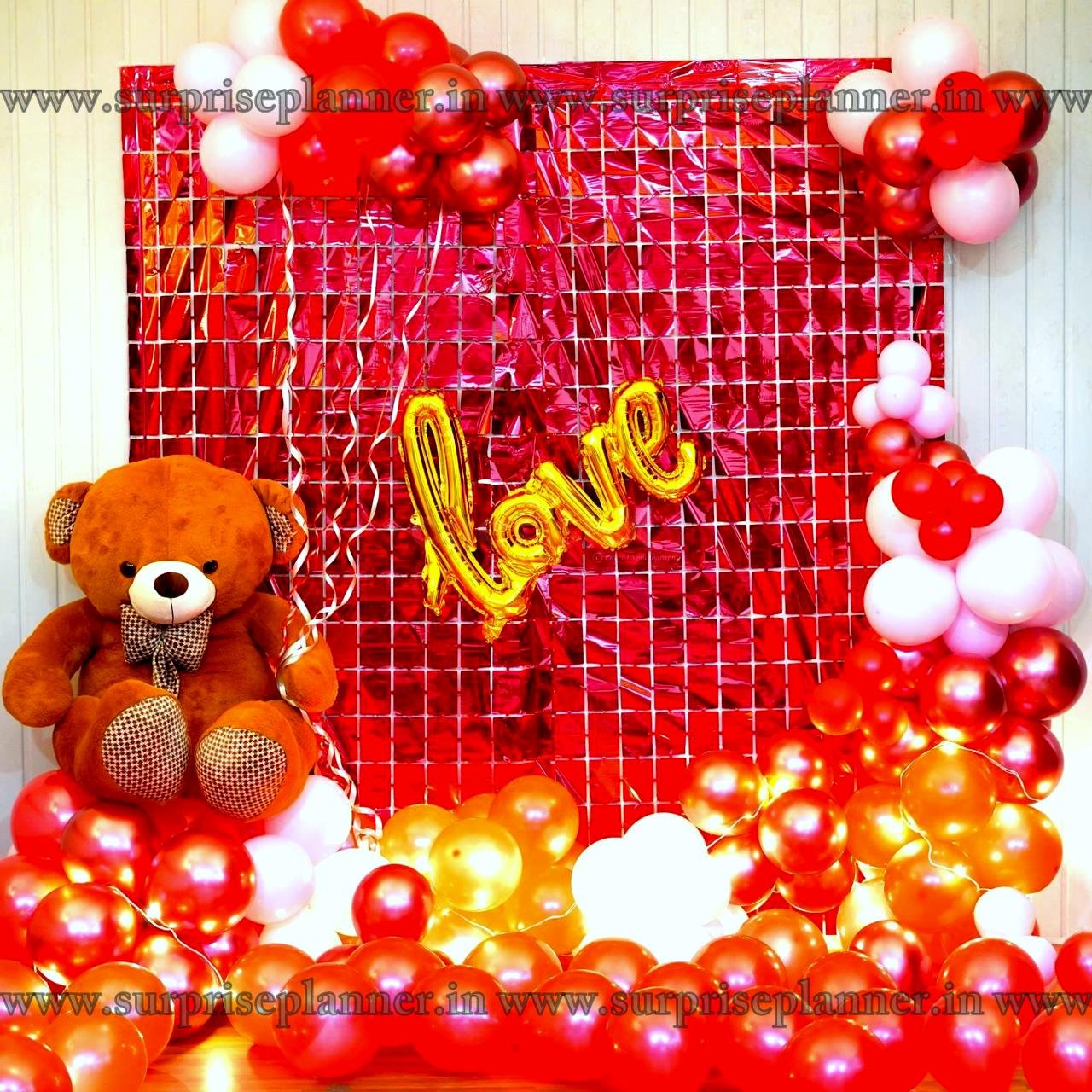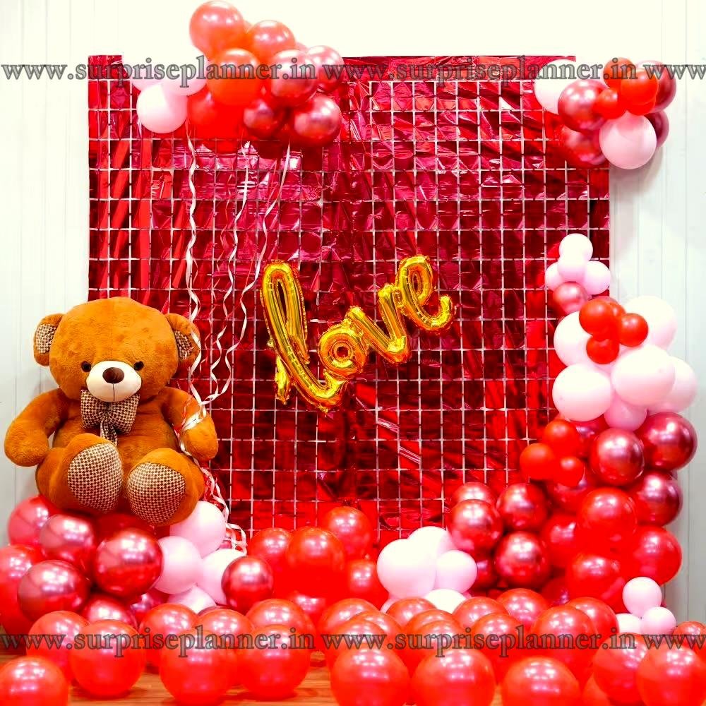 Celebrate your special moments with this Romantic Love Theme Decoration — a charming and cozy setup by Surprise Planner, perfect for anniversaries, proposals, birthdays, or romantic surprises. The decor features a red metallic backdrop adorned with balloon garlands in shades of red, white, and pink, symbolizing love and togetherness.