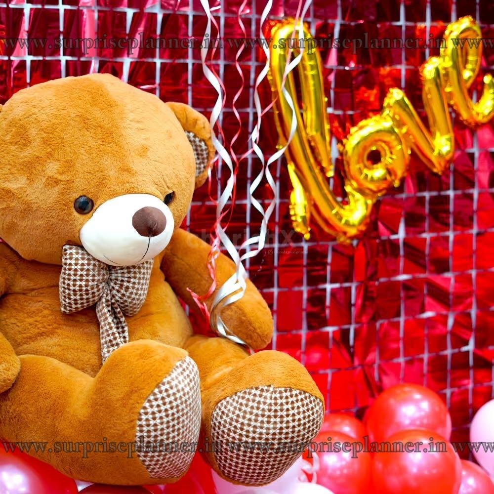 A giant teddy bear adds a cute and heartwarming touch, while the golden “Love” foil balloon makes it a perfect photo booth for couples. This setup creates an intimate and elegant ambiance for any indoor celebration — whether it’s at home, a hotel room, or a private dinner space.