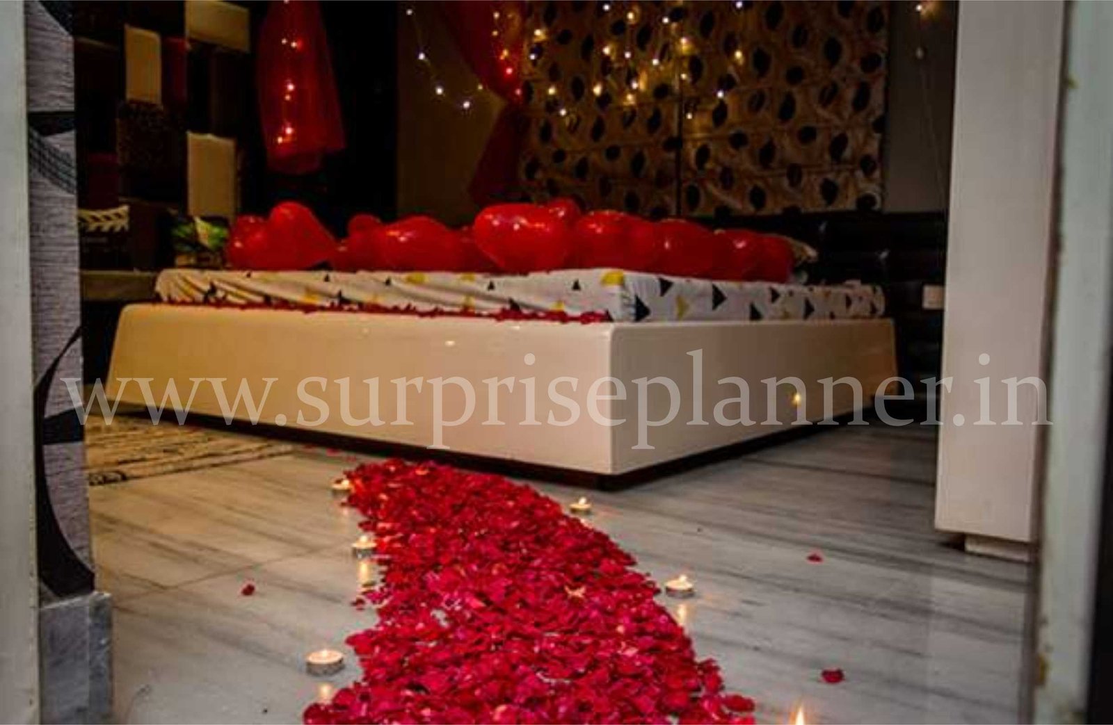 Turn the bedroom of a newly married couple into a lap of romance as you welcome them into a mesmerizing decor done just for them! A bed of roses on the floor and heart-shaped balloons floating on the bed will leave them overwhelmed as they enter the room with gleaming eyes. A canopy-like structure full of lights right above the bed will make the decor so intimate and cozy they would fall in love again! Book this surprise to celebrate an anniversary, or a romantic birthday as well. romantic night room decoration in all major metro cities.