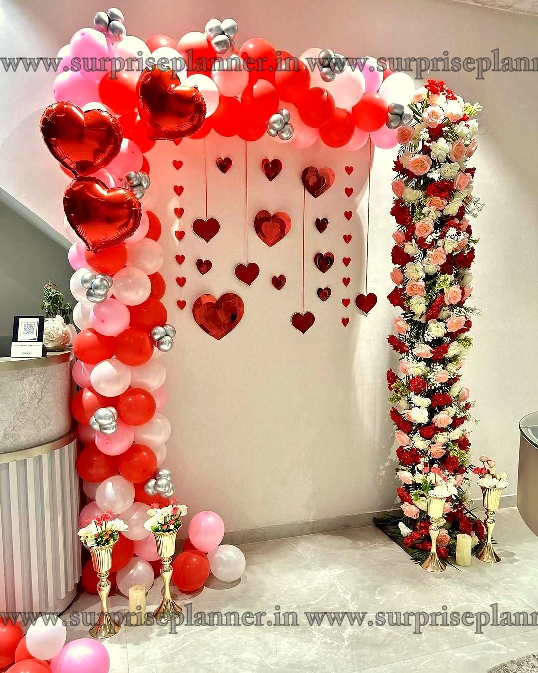 The setup features a beautifully styled balloon arch in shades of red, blush pink, white, and silver, paired with glossy heart-shaped foil balloons. Delicate hanging heart cutouts add depth and romance, while the highlight is a full-length floral pillar crafted with premium artificial roses in red, white, and pastel tones. Golden décor elements and candle-style stands complete the royal look, making it ideal for proposals, romantic surprises, and luxury photoshoots.
