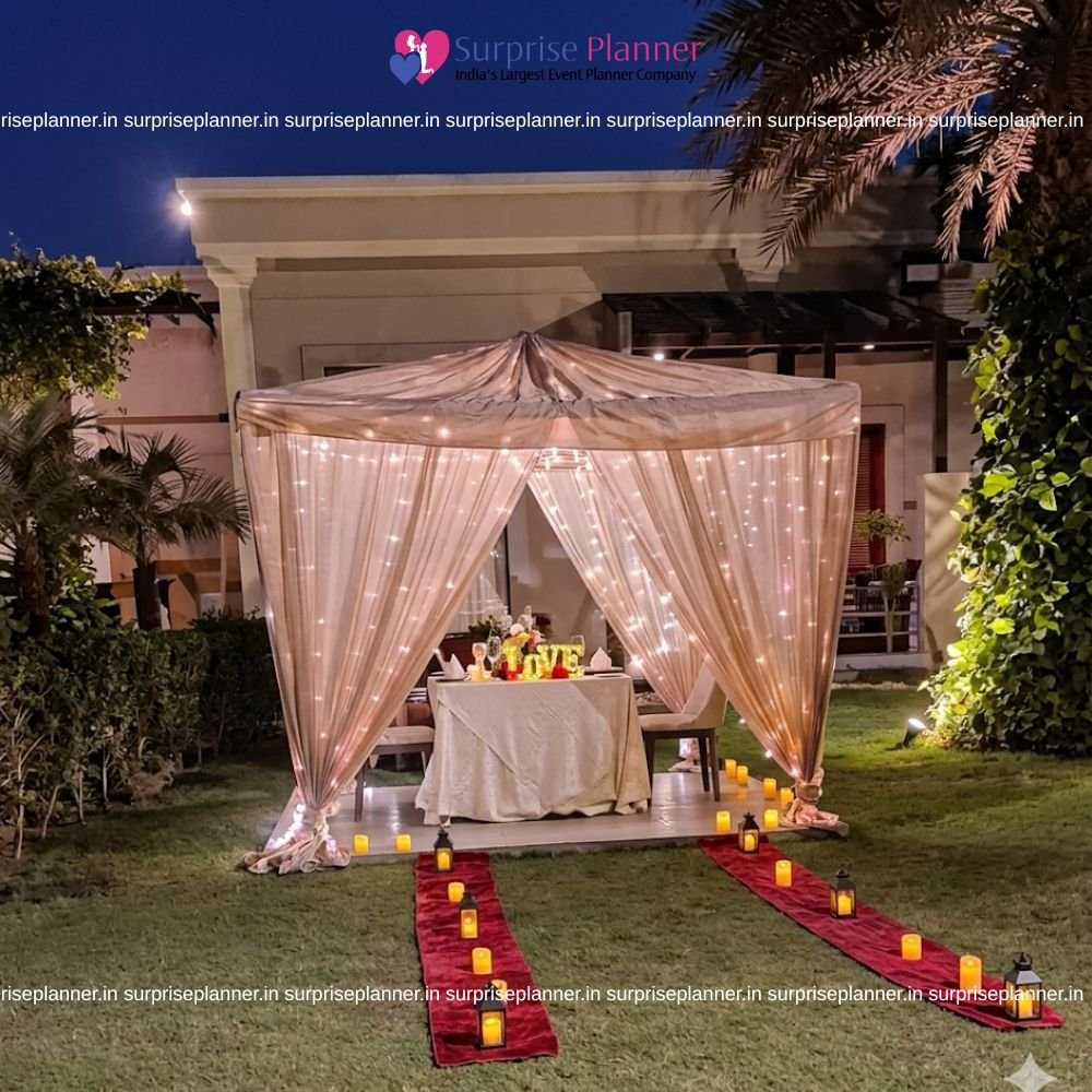 Step into a world of elegance and romance with our Royal Garden Cabana Candlelight Dinner Experience, designed to create a truly magical evening for couples. Set in a serene outdoor space, this luxurious setup offers the perfect blend of privacy, beauty, and intimacy.