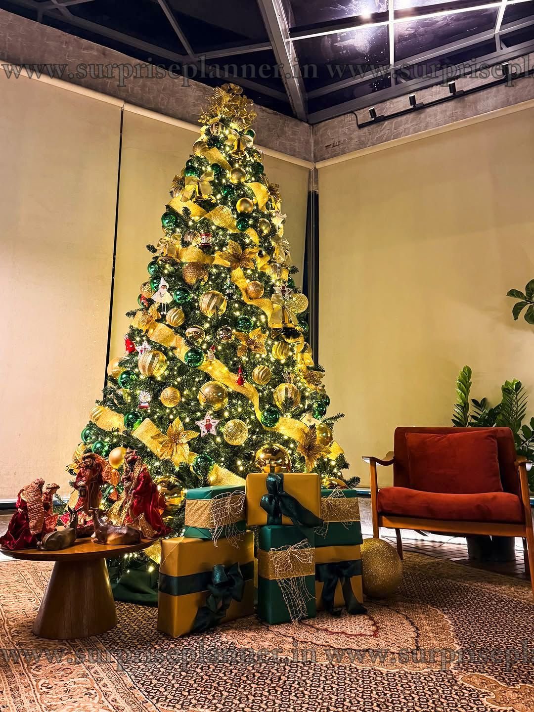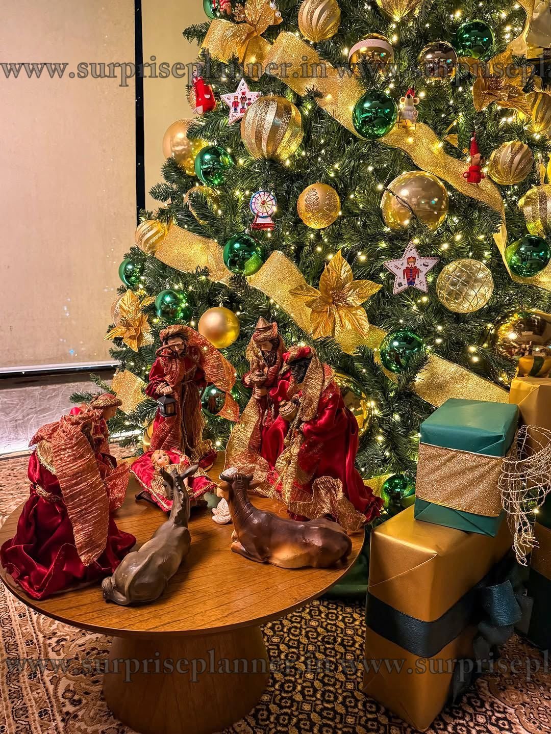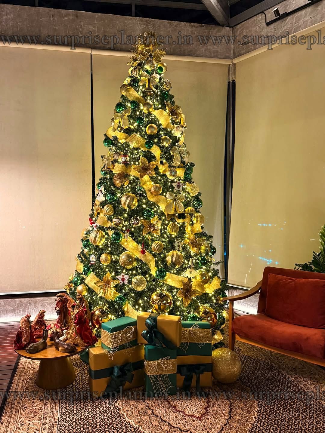 Perfectly curated by Surprise Planner, this setup blends classic Christmas charm with a modern luxury aesthetic. The coordinated gift boxes at the base and soft warm lighting make it an ideal centerpiece for Christmas celebrations, photoshoots, parties, proposals, and festive gatherings. Whether placed in a living room, lobby, or event venue, this décor creates a magical and Instagram-worthy festive atmosphere.