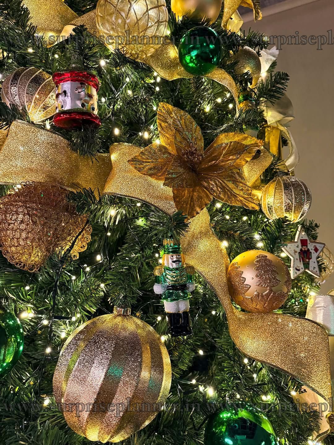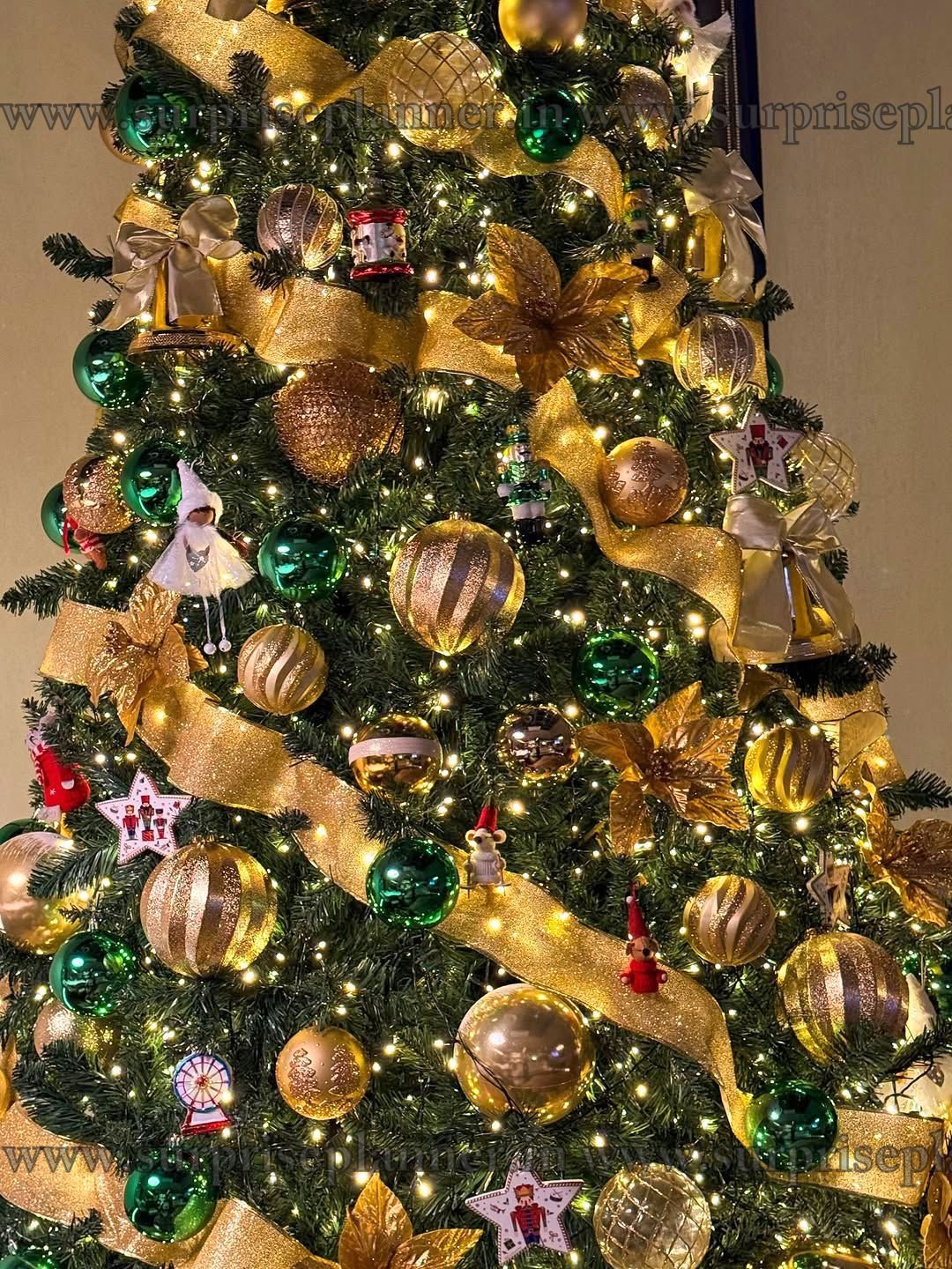 Bring home timeless festive elegance with our Royal Gold & Emerald Christmas Tree Decoration, designed to create a luxurious Christmas ambiance for homes, hotels, cafés, corporate spaces, and private celebrations. This beautifully styled Christmas tree features a rich combination of gold ribbons, shimmering ornaments, emerald green baubles, warm fairy lights, and festive figurines that instantly elevate the holiday mood.