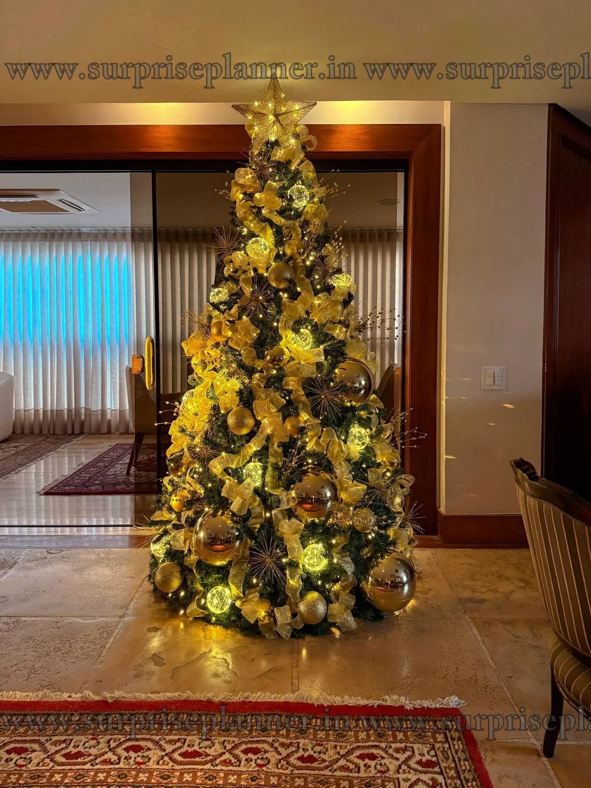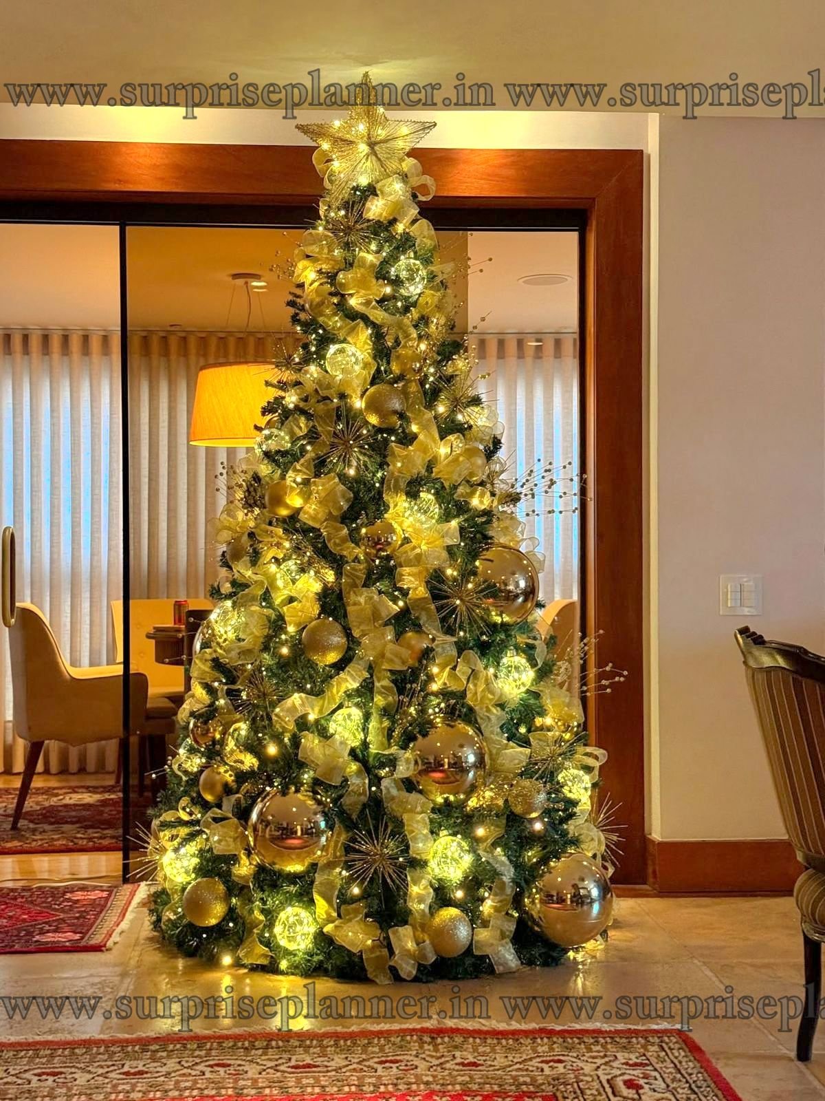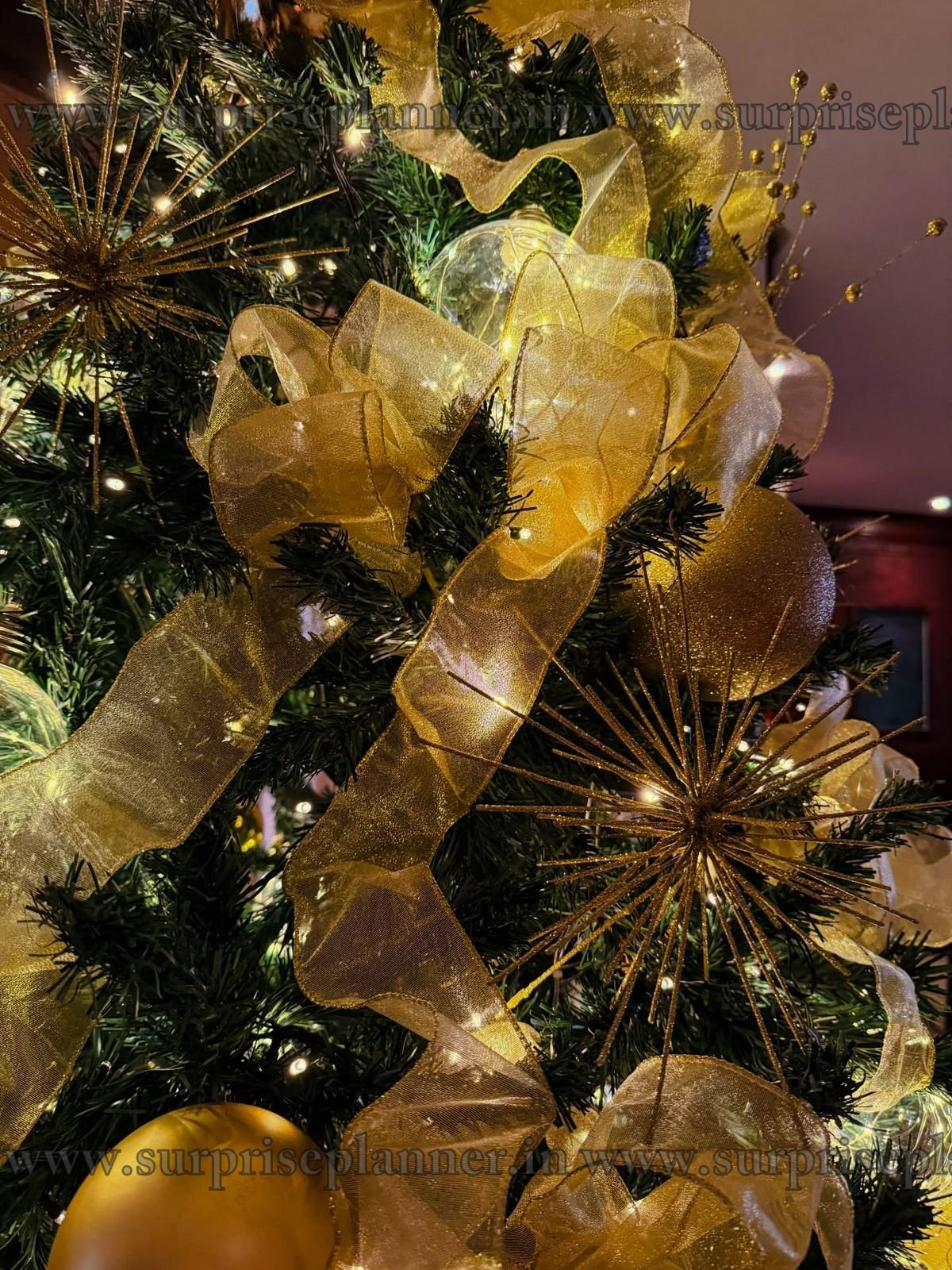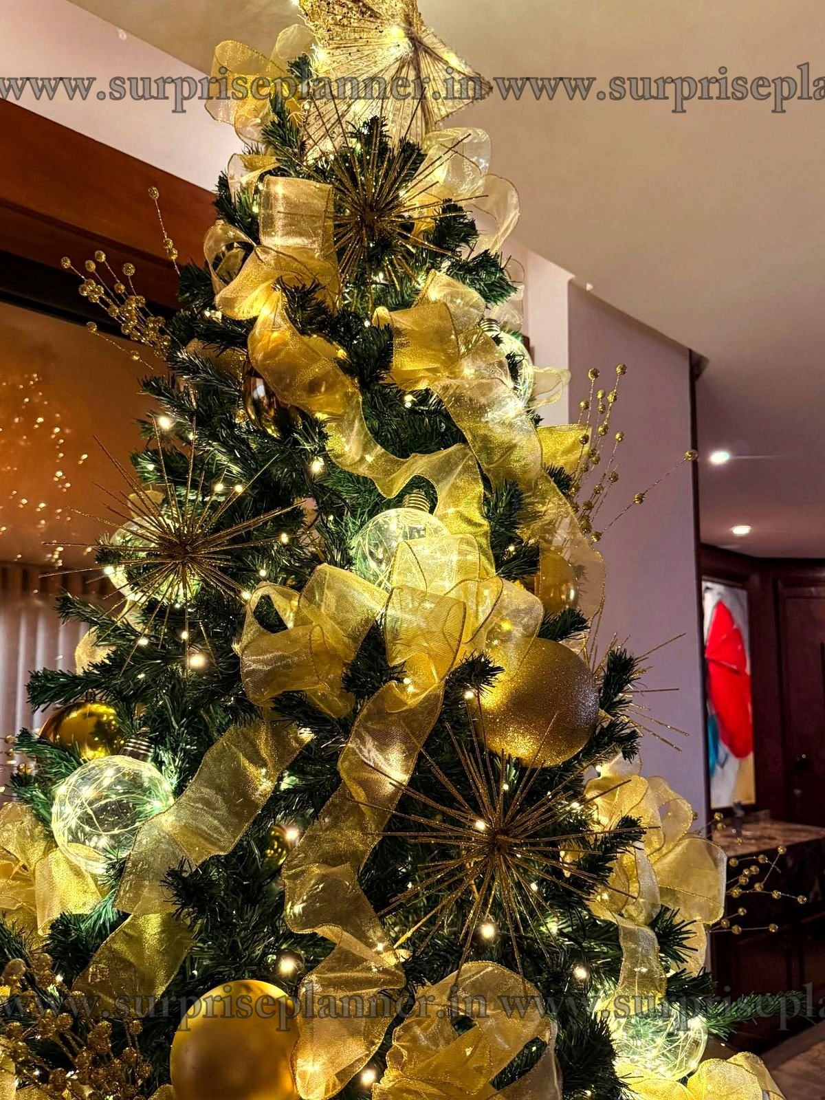Create a warm, elegant, and luxurious festive atmosphere with our Royal Golden Glow Christmas Tree Decoration, thoughtfully curated for premium homes, luxury apartments, hotels, corporate spaces, and private celebrations. This stunning Christmas tree is adorned with rich golden ribbons, shimmering baubles, starburst ornaments, and warm white fairy lights that radiate a soft, magical glow.