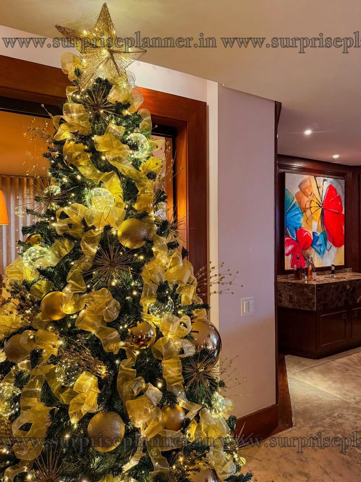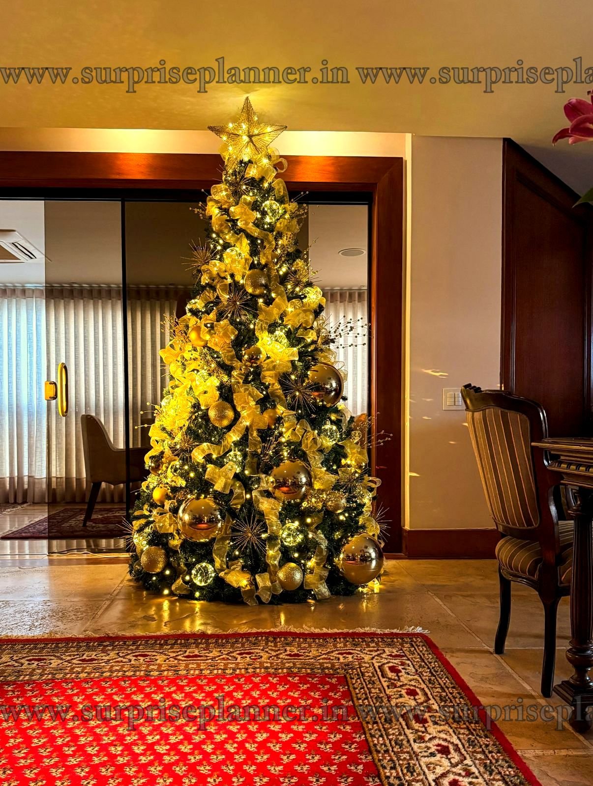 The sophisticated gold-on-green theme adds timeless charm and elegance, making it perfect for refined Christmas décor lovers. Styled by Surprise Planner, this setup transforms any space into a festive masterpiece—ideal for Christmas parties, intimate celebrations, festive photoshoots, and luxury holiday décor experiences.