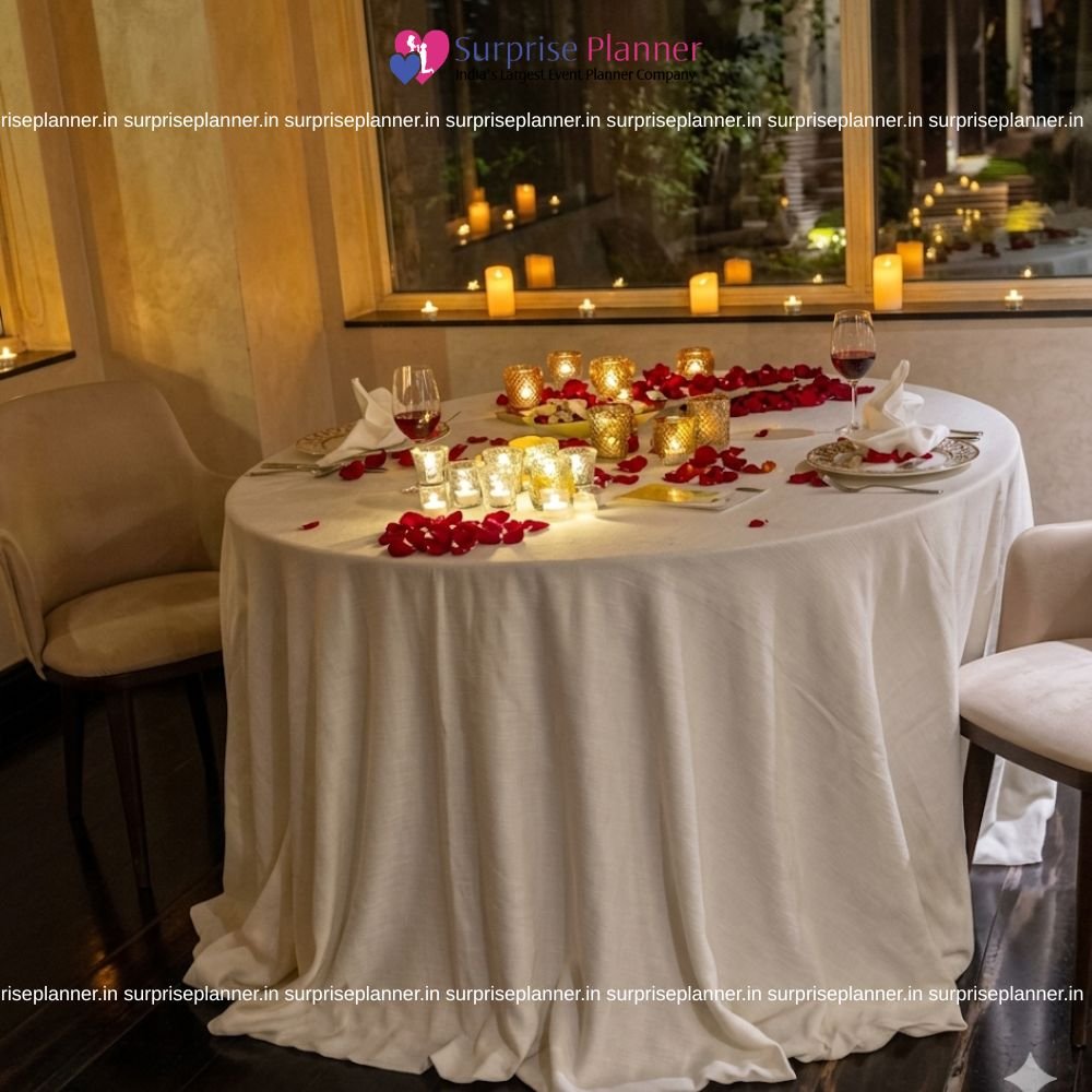As seen in the reference, the experience begins with a beautifully arranged indoor candlelight dinner setup. A round table is adorned with soft glowing candles, rose petals, and elegant table décor, creating an intimate and warm ambiance. The cozy indoor setting near large windows adds a sophisticated charm, while the delicious multi-course meal enhances the romantic vibe.