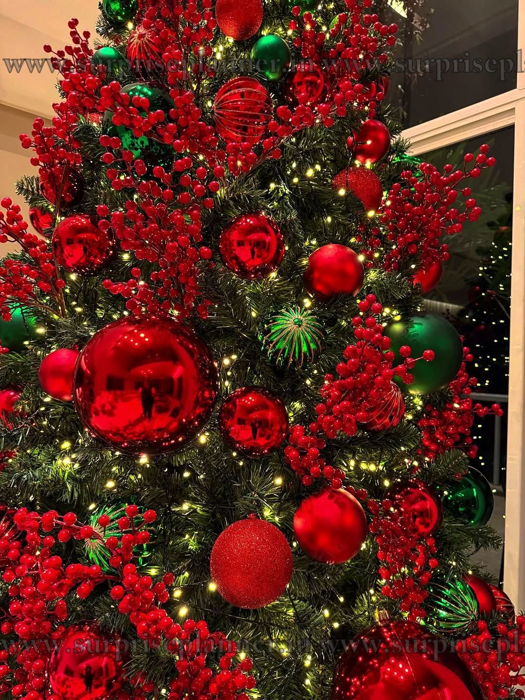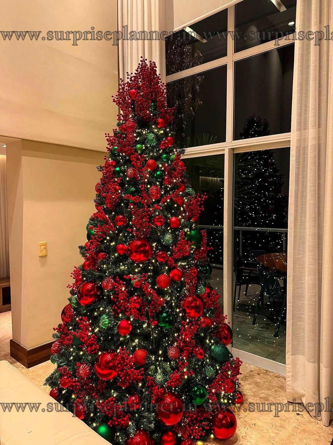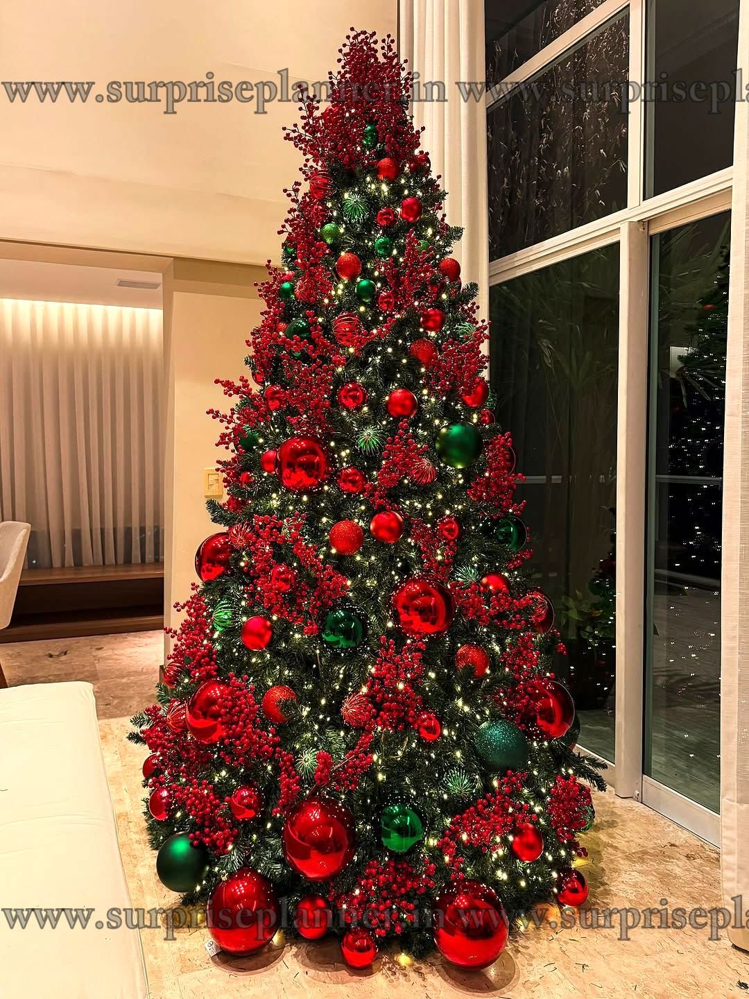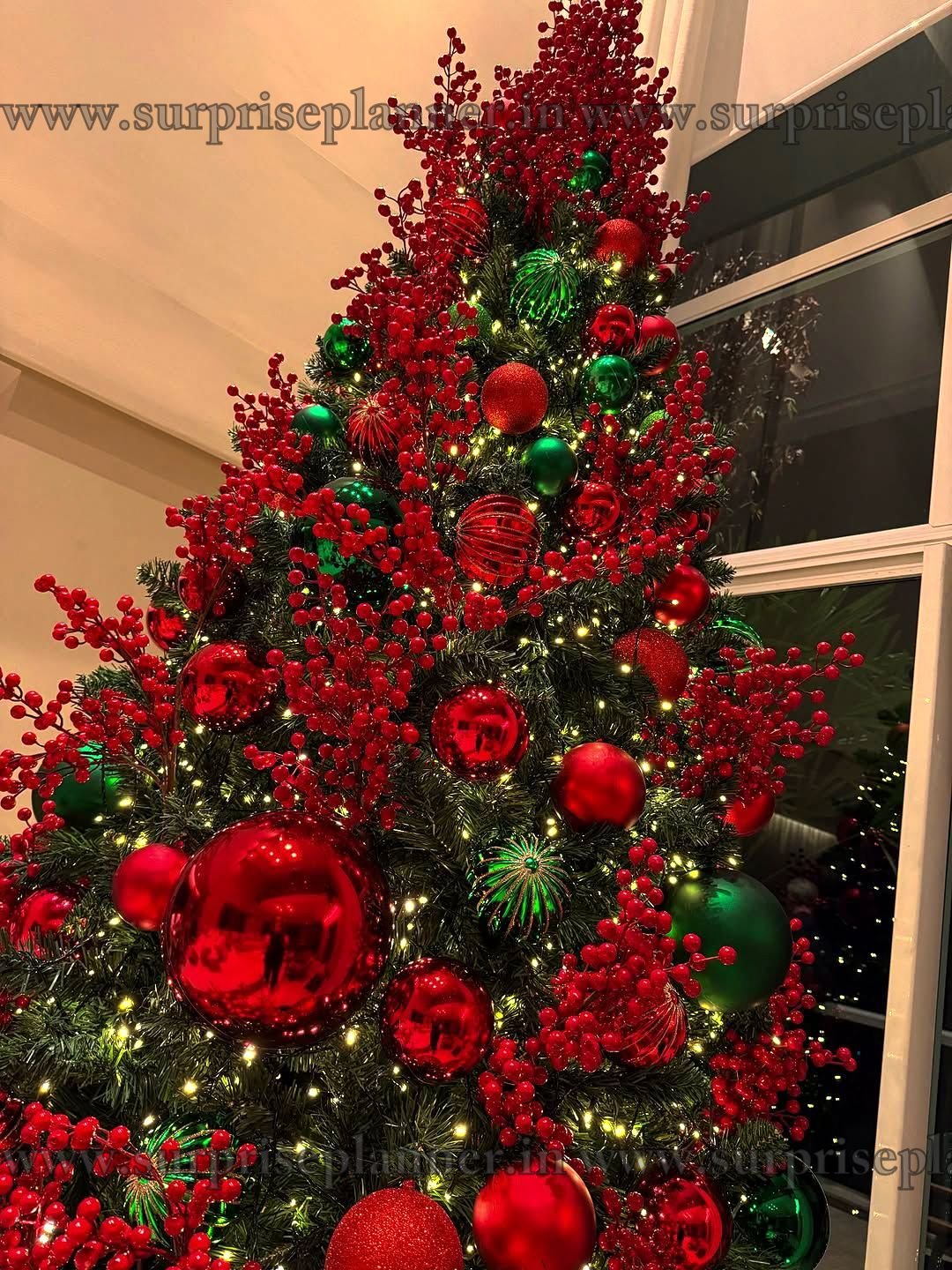 Bring the timeless magic of Christmas into your space with our Royal Red & Green Luxury Christmas Tree Décor, a classic festive theme designed for elegance, warmth, and grandeur. The image showcases a tall, lush Christmas tree richly adorned with deep red berry sprays, oversized glossy red baubles, emerald green ornaments, and warm white fairy lights, creating a breathtaking festive focal point.
