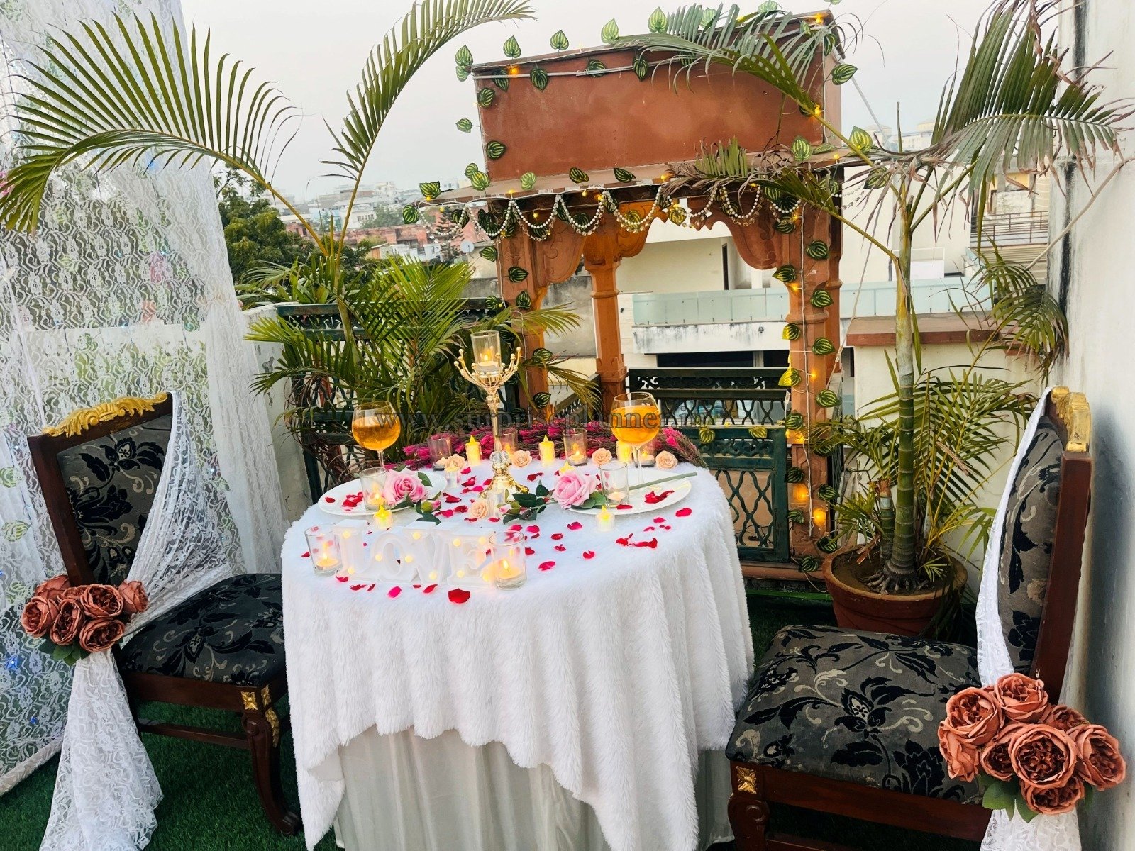 Celebrate love in an intimate and elegant setting with our Royal Terrace Romance, a beautifully styled private rooftop candlelight setup designed for proposals, anniversaries, and romantic date surprises. This dreamy décor transforms a simple terrace into a luxurious love nest surrounded by greenery, soft lights, and timeless charm.