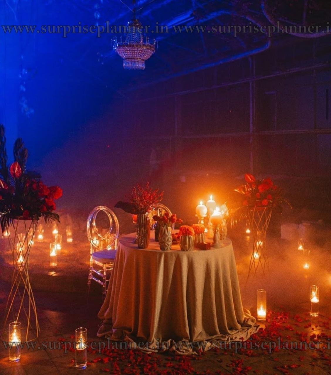 Make a memorable evening at home with our Sparkling Romantic Dining Setup. This set is ideal for an anniversary, date night, or special event. It will convert your dining area into an intimate paradise. Elegant candles give a warm, mellow glow, while string lights provide a dazzling atmosphere, adding an aura of magic. The table is decked with beautiful satin table runners and fashionable place settings, glass glasses, and magnificent entrees. It is also complete with accessories. Fresh flowers and gold accents complement the appearance, resulting in an elegant yet relaxing ambiance. Everything you need for a memorable and romantic evening.