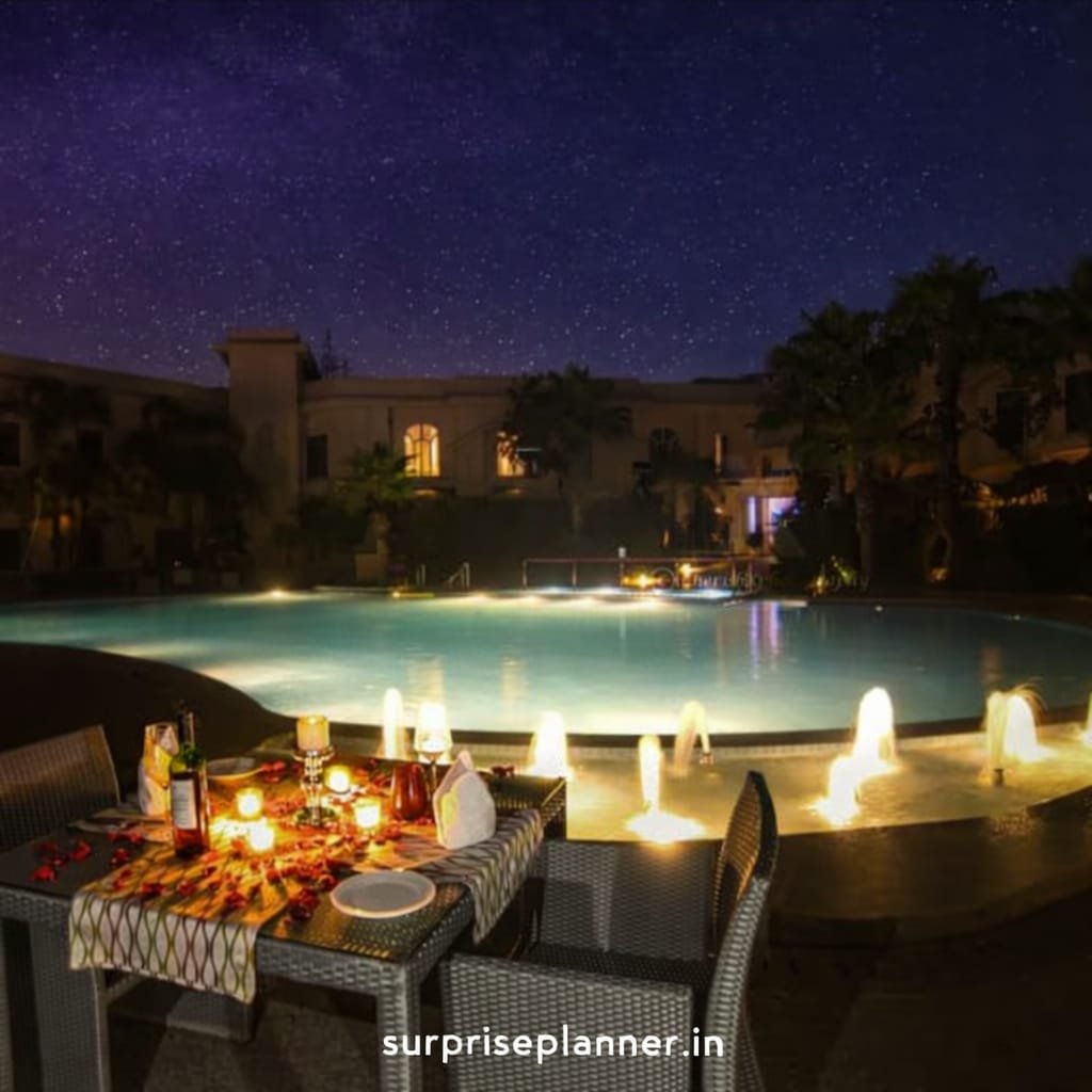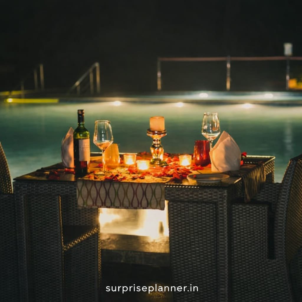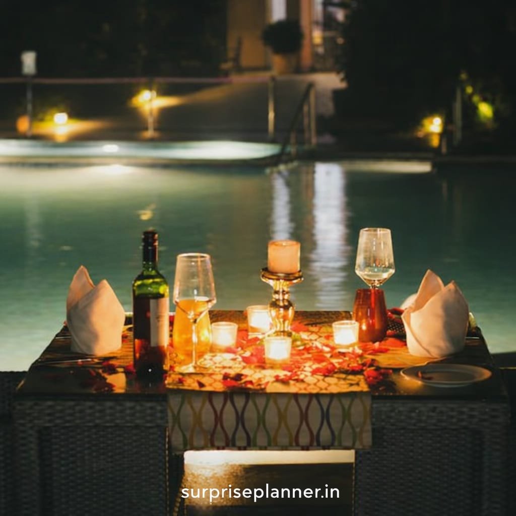 Make this Valentine’s Day truly unforgettable with our Starlit Poolside Valentine’s Candlelight Dinner. Set beside a serene pool under a star-lit sky, this romantic experience is crafted for couples who desire privacy, elegance, and timeless romance. The beautifully arranged dining table is adorned with rose petals, glowing candles, fine table linen, and warm ambient lighting, creating a dreamy atmosphere that speaks of love.