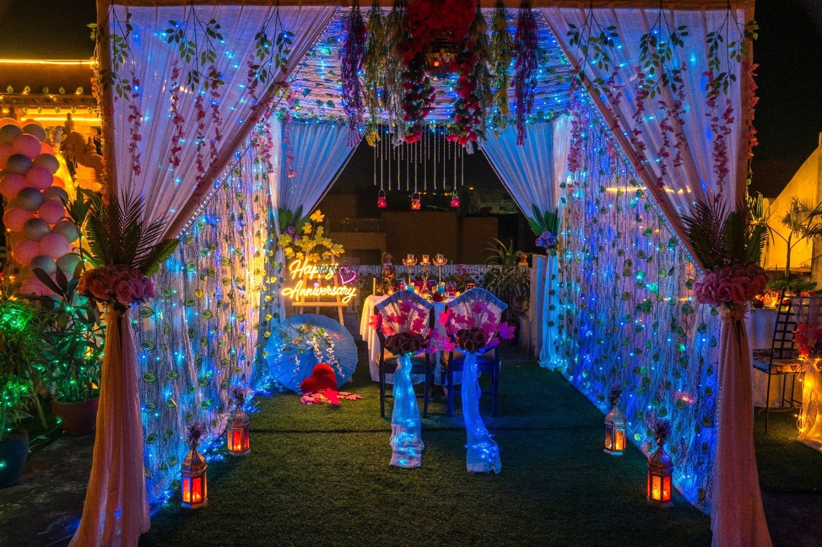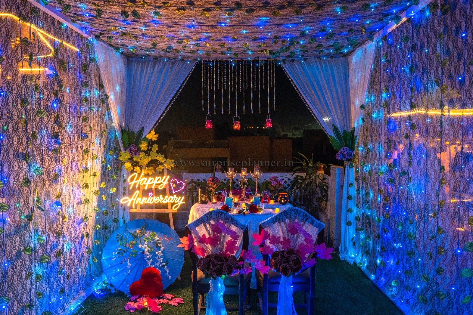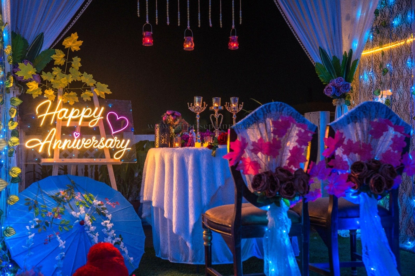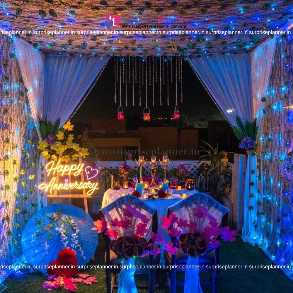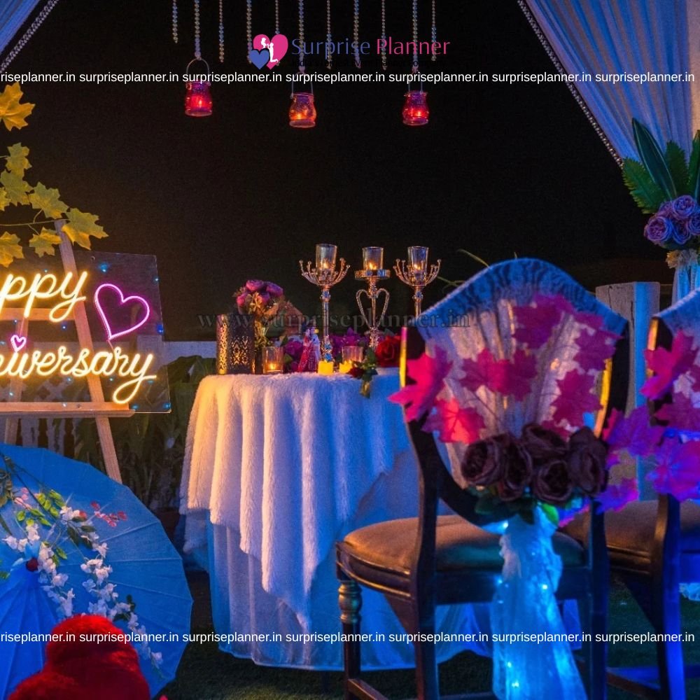 A bright “Happy Anniversary” neon sign enhances the personalized romantic vibe, making the moment even more special and memorable. The beautifully decorated chairs, floral accents, and aesthetic props like the decorative umbrella and heart cushion create a charming, Instagram-worthy setting perfect for capturing romantic memories.