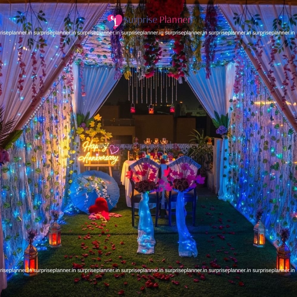 Celebrate your journey of love under a canopy of stars with our Starlit Sapphire Anniversary Cabana, a dreamy rooftop candlelight setup designed for intimate anniversaries and romantic date nights. This elegant décor transforms a simple terrace into a magical love retreat glowing with soft blue fairy lights and warm golden accents.