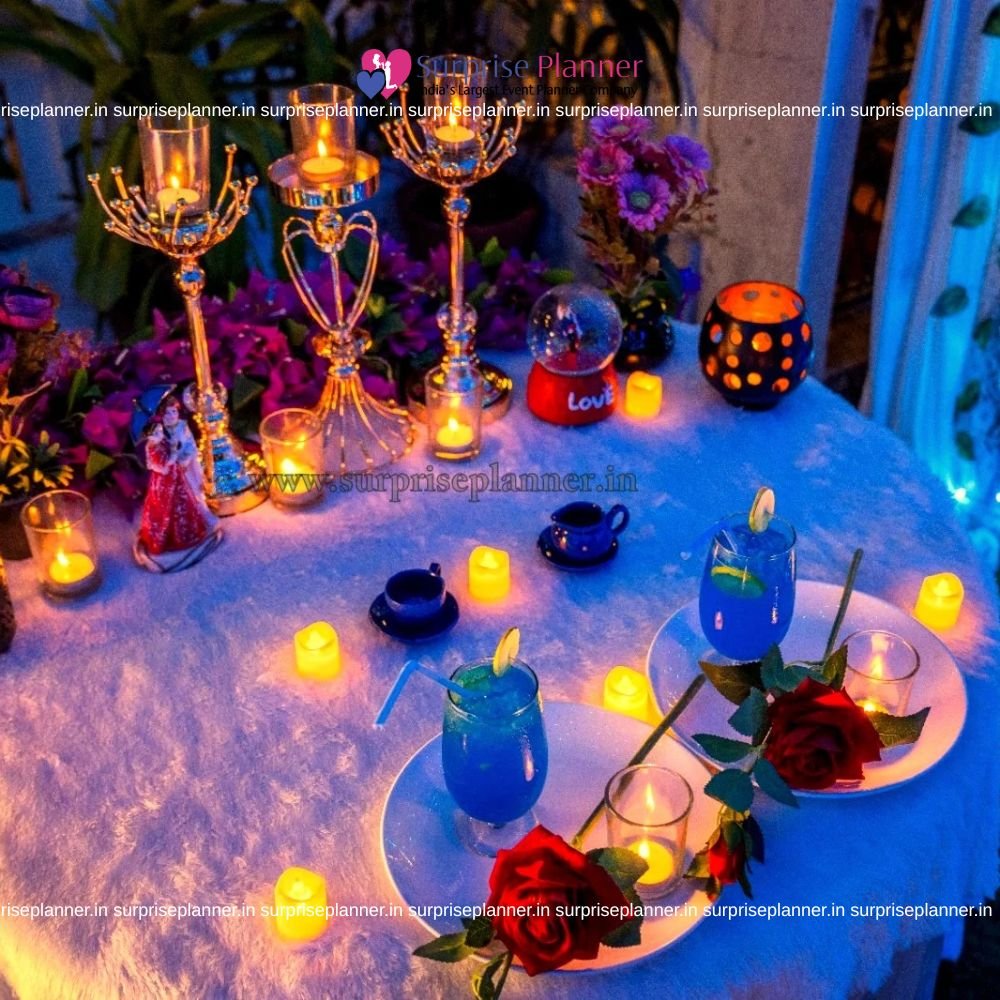 Ideal for wedding anniversaries, milestone celebrations, surprise date nights, or intimate birthday dinners, this private rooftop setup ensures exclusivity, elegance, and a magical atmosphere. The blend of sapphire blue lighting and warm candle glow creates the perfect balance between sophistication and romance.