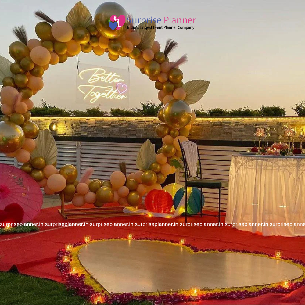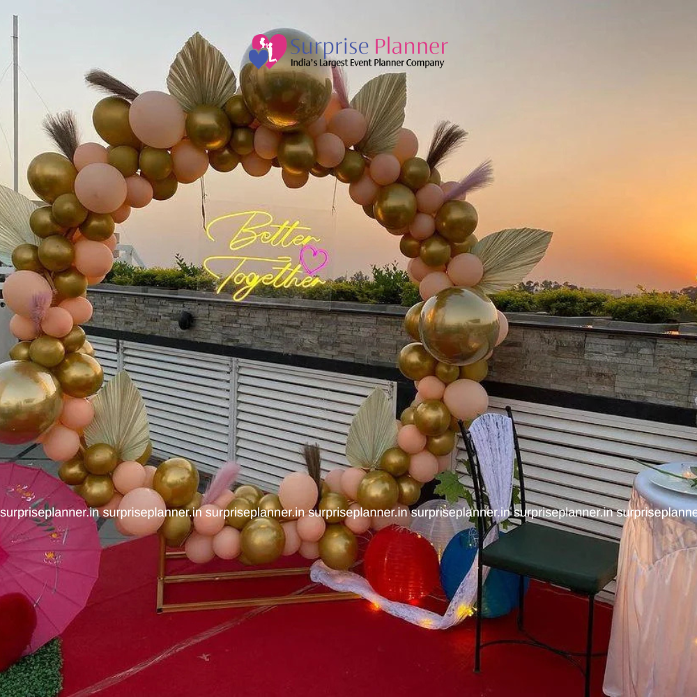 Enter into the world of magic with our magical Whimsical ring of dreams dinner. Featuring a giant ring with 200 gold chrome balloons and pink chrome feathers, you’ll feel like you’re dining under the stars as you enter this heavenly setting. As you walk through the door, a neon ‘Better Together’ light lights up the room to add a touch of glamour to your romantic dining experience. A big heart sits on the floor surrounded by flowers and fragrant candles, making it the perfect place for a proposal or an intimate celebration.