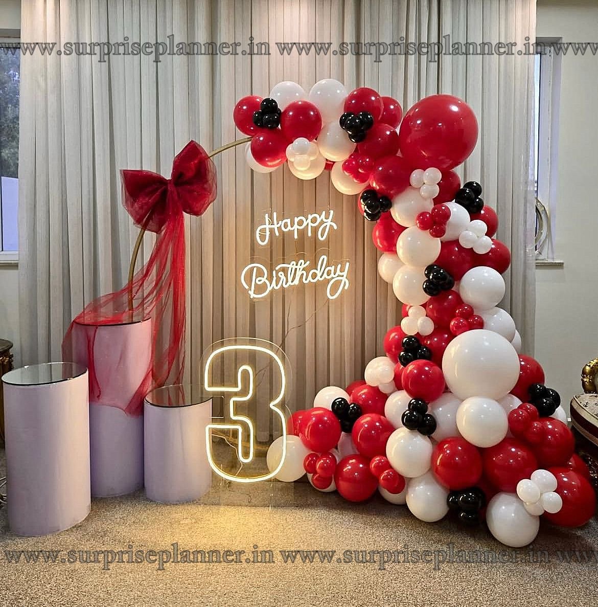 Make their third birthday unforgettable with this chic and vibrant decoration setup. A dynamic balloon garland in bold red, crisp white, and sleek black creates a visually striking focal point, cascading elegantly to the floor.