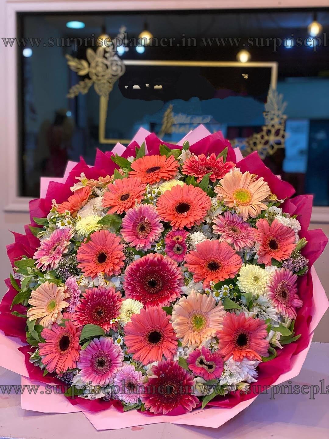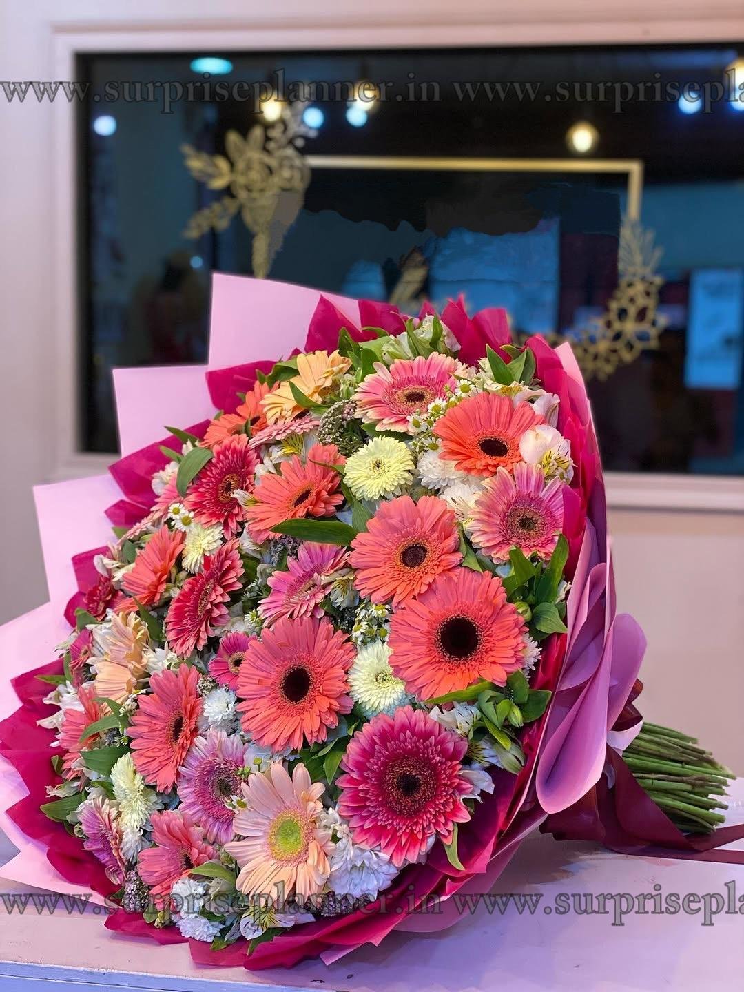 Wrapped in layers of elegant pink and magenta paper and tied with a stylish ribbon, this bouquet is a show-stopping gift for birthdays, congratulations, get well wishes, or simply to bring a smile to someone’s face.