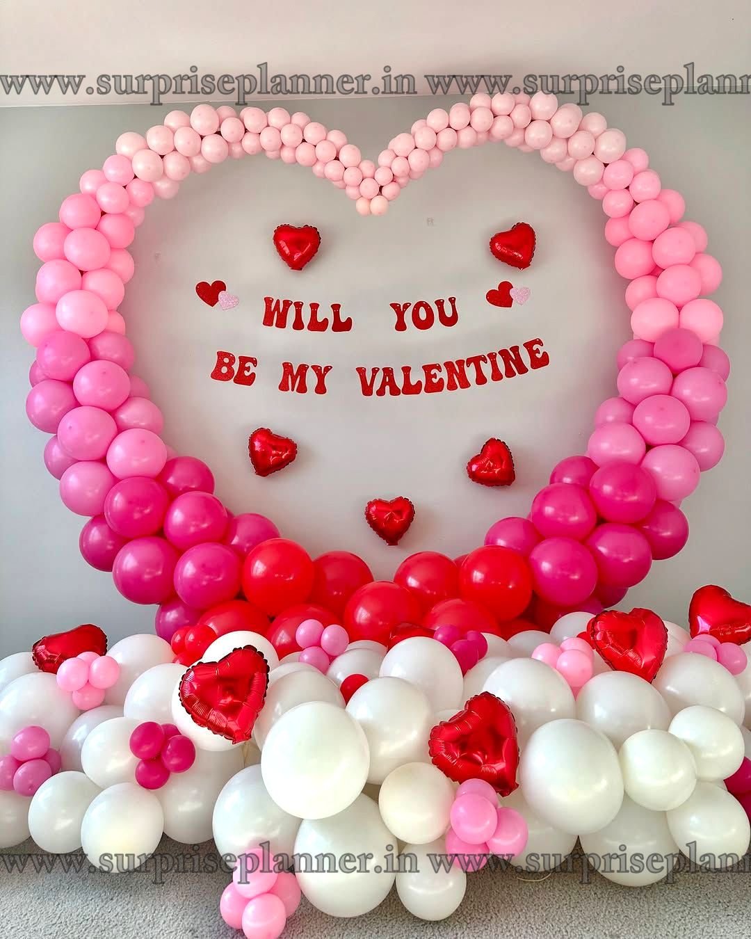 Create a magical and unforgettable Valentine’s moment with our “Will You Be My Valentine” Heart Balloon Proposal Setup. This stunning décor features a large heart-shaped balloon arch crafted with soft shades of pink, blush, red, and white balloons, symbolizing love, warmth, and romance. The centerpiece message “Will You Be My Valentine” is beautifully highlighted with red heart foil balloons, making it the perfect backdrop for heartfelt proposals and romantic surprises.