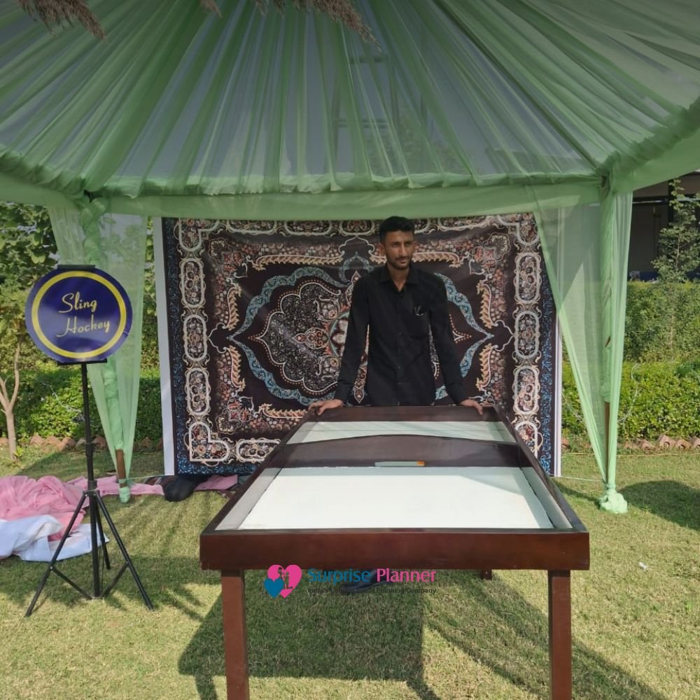 Add fast-paced excitement and competitive fun to your event with the Wooden Sling Hockey Game. This highly engaging tabletop game is perfect for birthday parties, carnival events, haldi functions, and corporate gatherings in Jaipur. Designed with a premium wooden finish, the game features a smooth playing surface where players use elastic bands to sling pucks through a center gap into the opponent’s side.