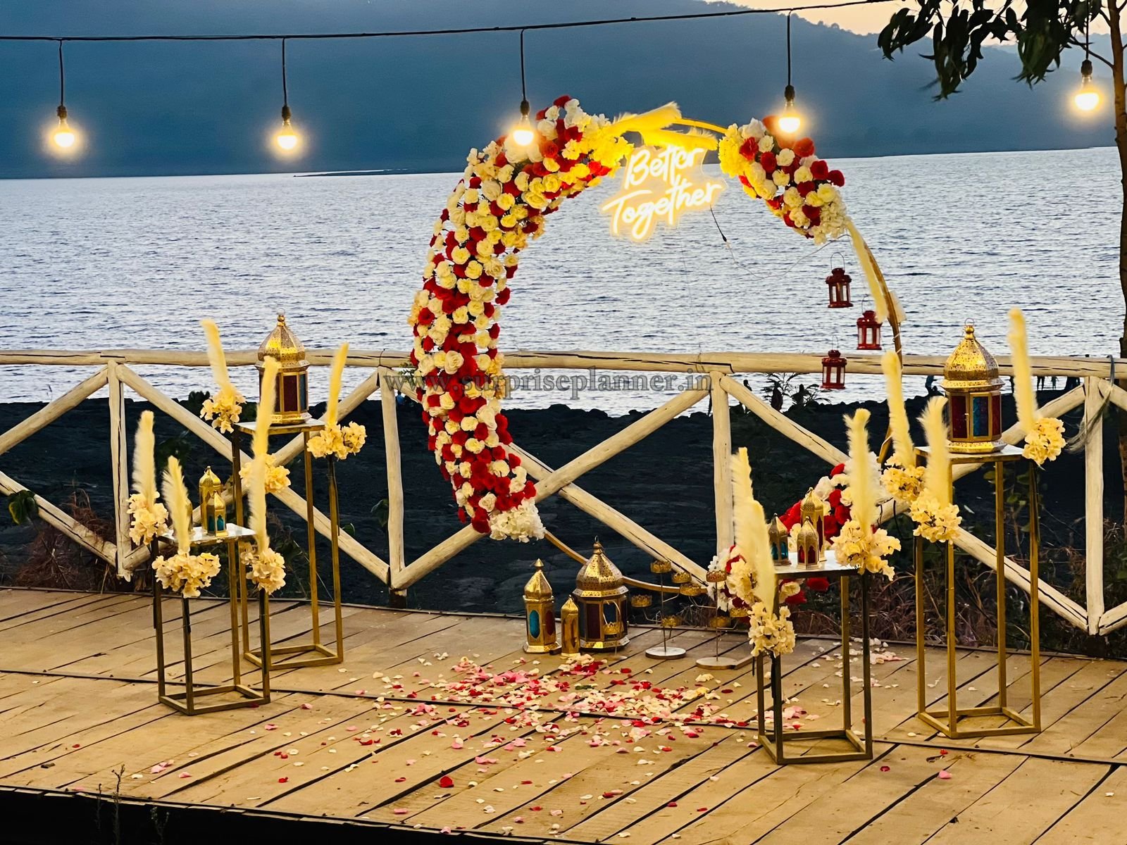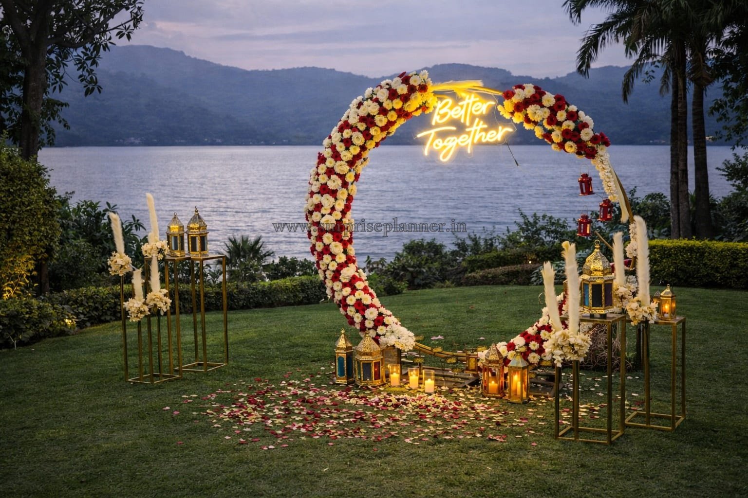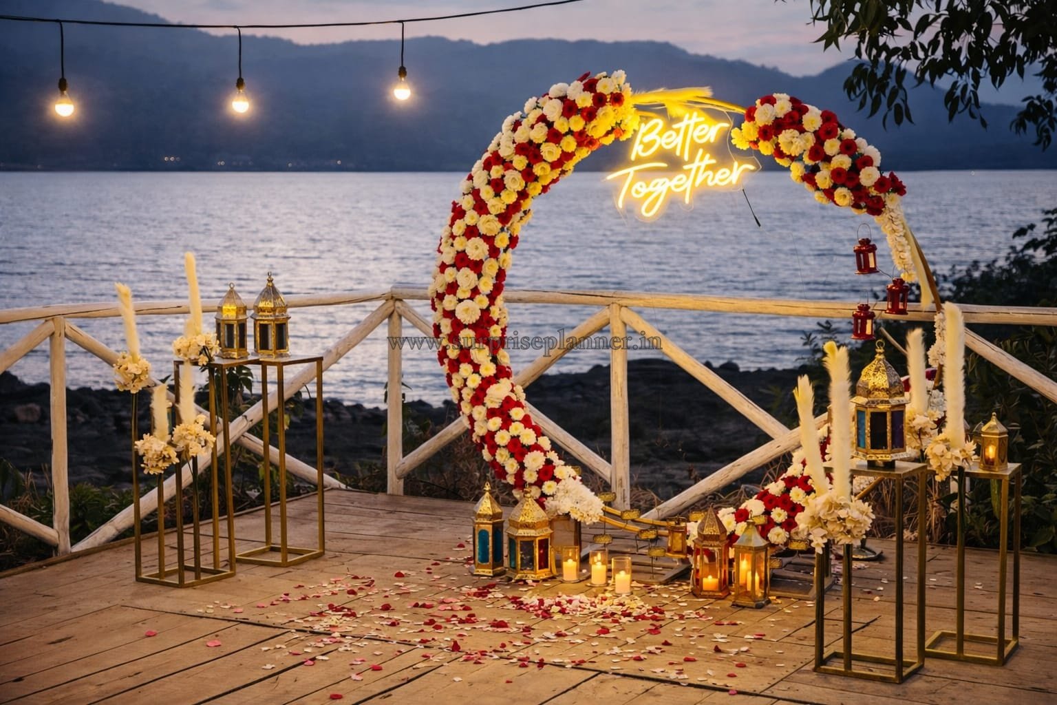 Set against the serene backdrop of Pawna Lake and surrounded by the majestic hills of Lonavala, this premium décor creates a magical sunset setting. The highlight of the setup is a beautifully crafted circular floral arch adorned with red and white roses, symbolizing love and purity. At the center, a glowing “Better Together” neon sign adds a modern, Instagram-worthy charm to your special moment.