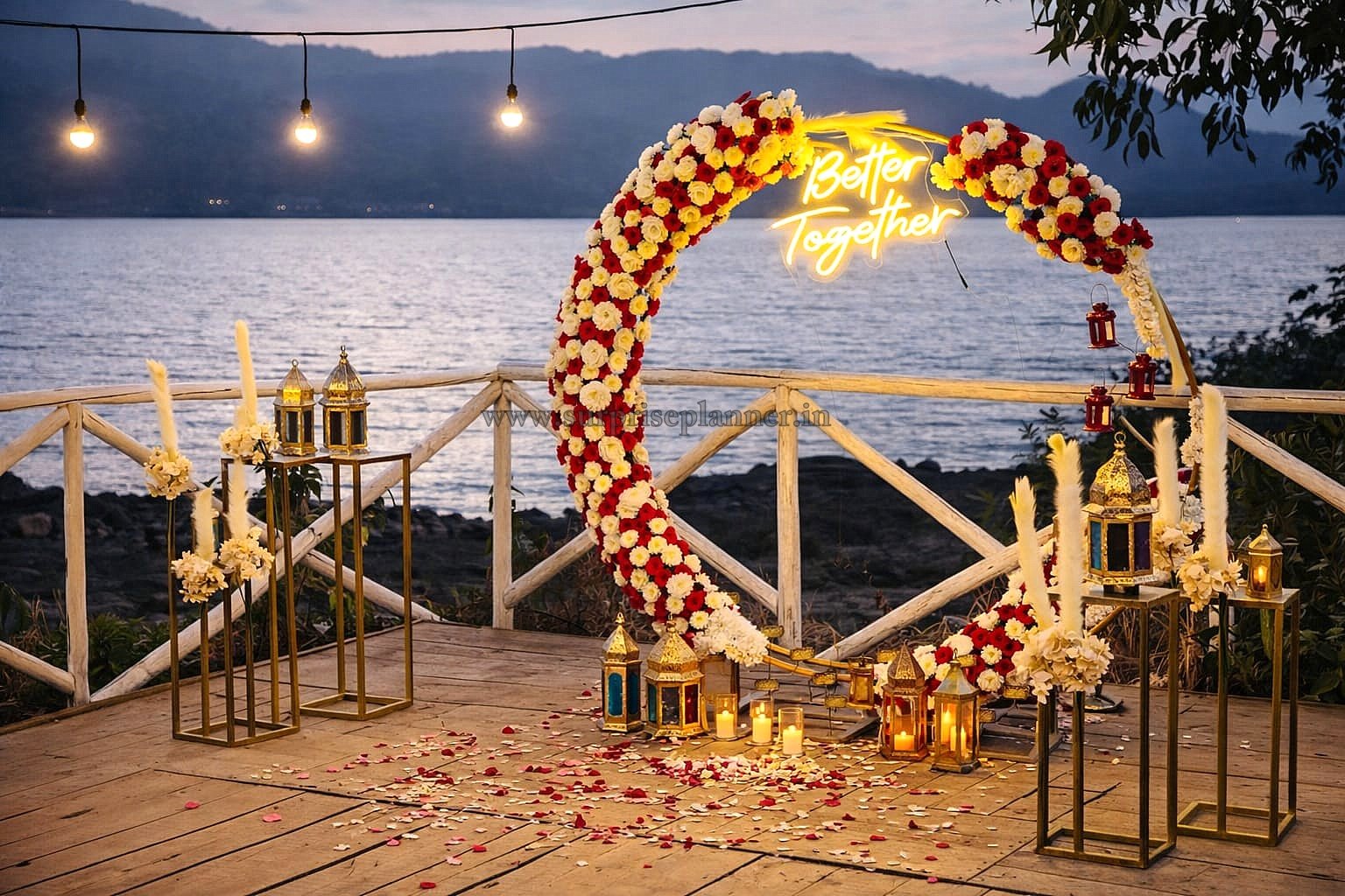 As your partner walks into the setup, soft hanging bulbs twinkle overhead while elegant golden lanterns and floral arrangements create a warm, intimate ambiance. The wooden deck is delicately styled with scattered rose petals, adding romance to every step. With the calm lake waters and evening sky in the background, the entire atmosphere feels straight out of a romantic movie.