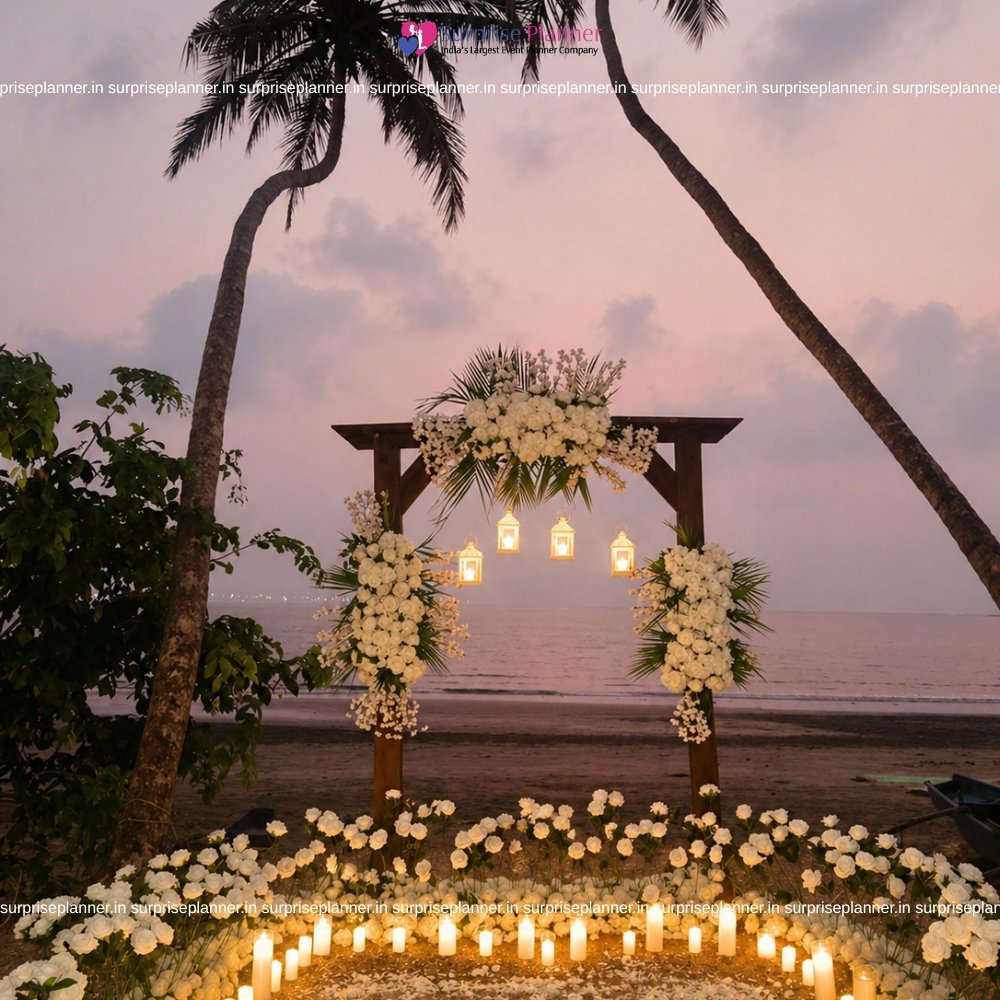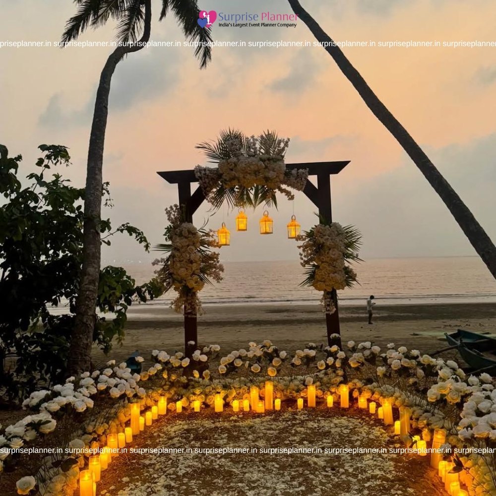 This setup is ideal for proposals, anniversaries, pre-wedding shoots, or intimate celebrations, offering a calm yet luxurious environment. The gentle ocean breeze, natural lighting, and minimalist color palette elevate the entire experience, making every photograph look effortlessly stunning.