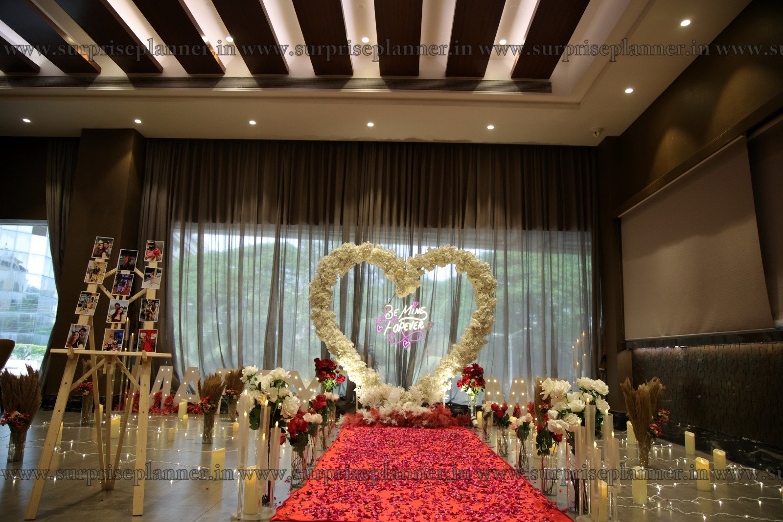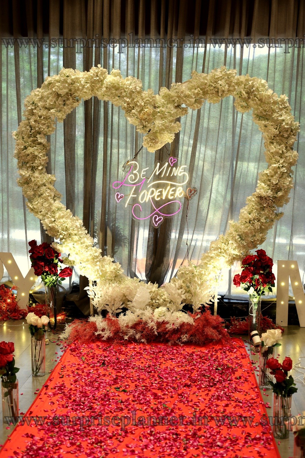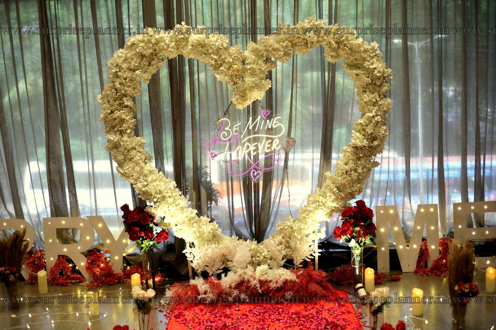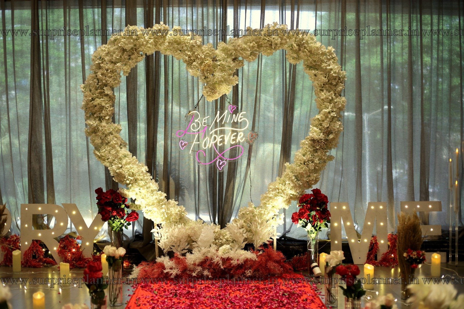 Turn your dream proposal into reality with our “Forever Yours Romantic Indoor Setup” in Mumbai by Surprise Planner. Designed to create a heartfelt and intimate atmosphere, this luxurious setup features a stunning floral heart arch with a glowing “Be Mine Forever” neon sign — the perfect backdrop to ask the most important question of your life.