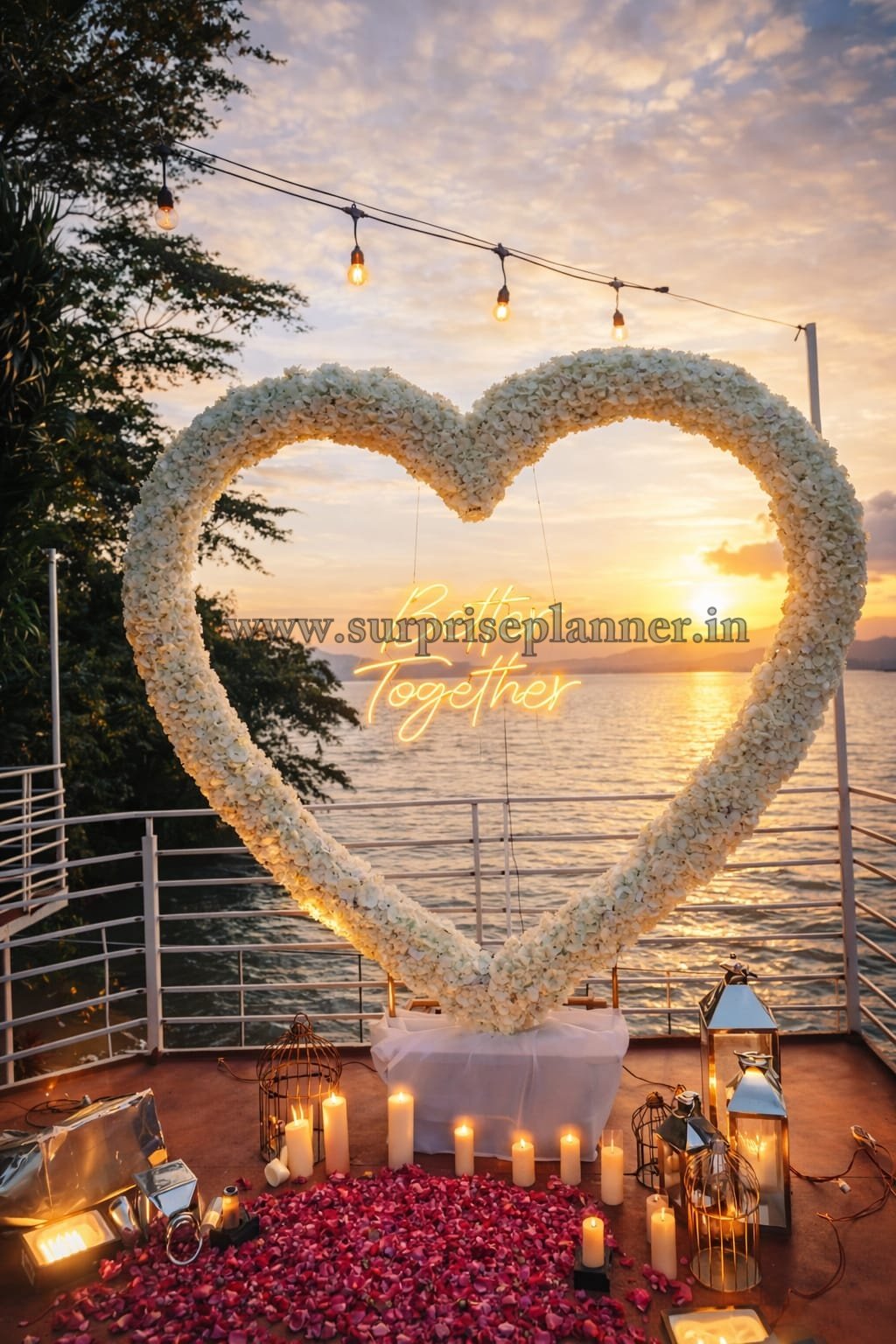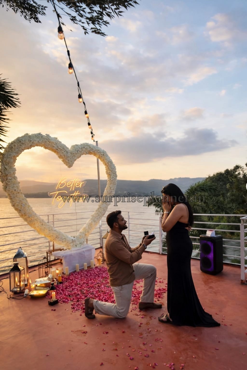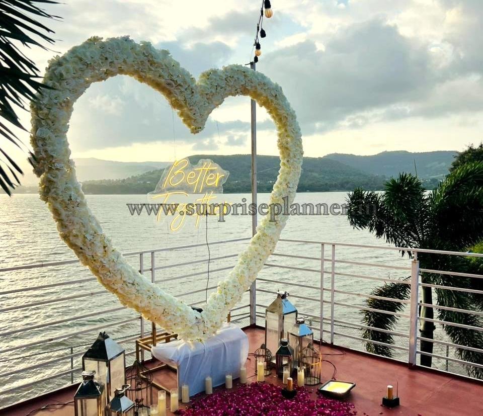 Create an unforgettable “Yes” moment with our Lonavala Golden Hour Heart Proposal, a dreamy lakeside terrace setup designed for couples who want elegance, intimacy, and breathtaking sunset views.