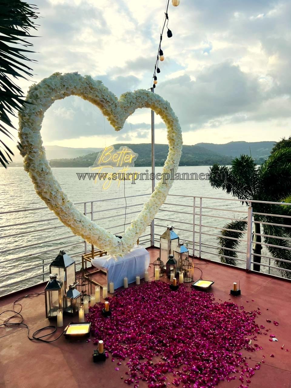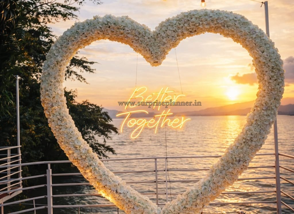 Set against the calm waters and scenic hills of Lonavala, this proposal experience captures the magic of golden hour perfectly. The highlight of the décor is a stunning white floral heart arch, beautifully illuminated with a glowing “Better Together” neon sign at the center. As the sun sets over the lake, the sky transforms into soft hues of gold, pink, and blue—creating a naturally romantic backdrop for your big question.