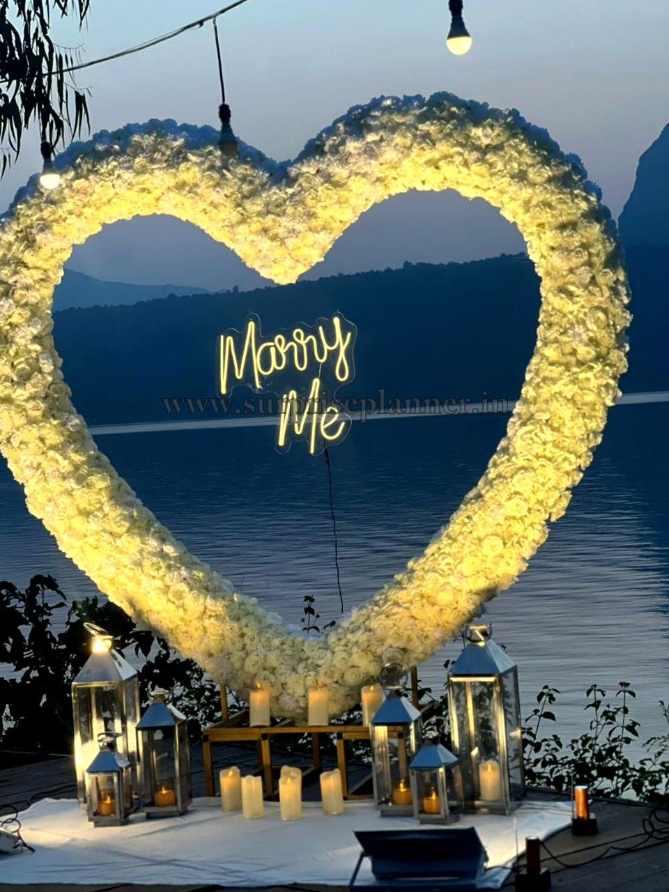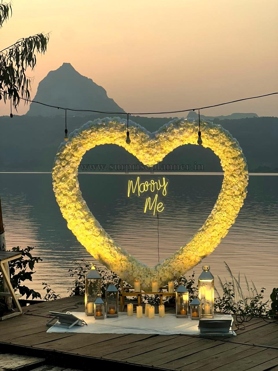 The highlight of this setup is a grand heart-shaped floral backdrop glowing with warm golden lights, perfectly framing the illuminated “Marry Me” neon sign at the center. As the sun sets behind the mountains and reflects on the lake, the entire ambiance turns golden and cinematic — making it one of the most romantic proposal experiences in Lonavala.