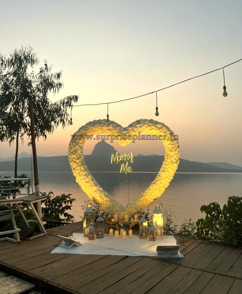 Create the most unforgettable moment of your life with our Lonavala Sunset Heart Proposal, a breathtaking lakeside proposal setup designed for magical “yes” moments. Set against the serene waters and majestic hills of Lonavala, this dreamy décor transforms nature’s beauty into a romantic fairytale setting.