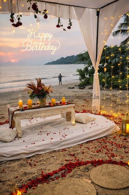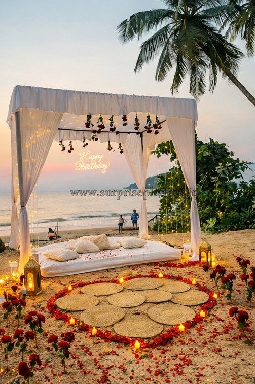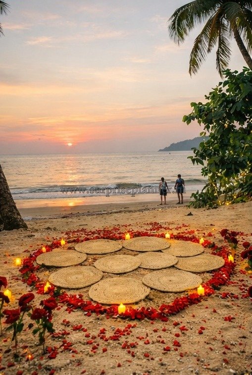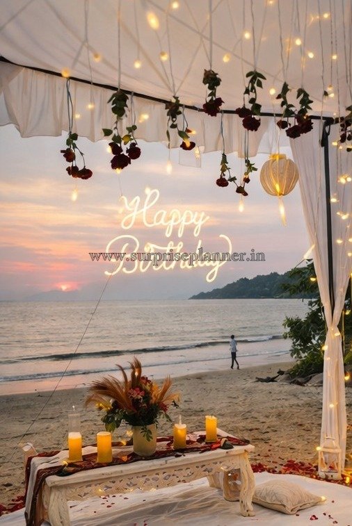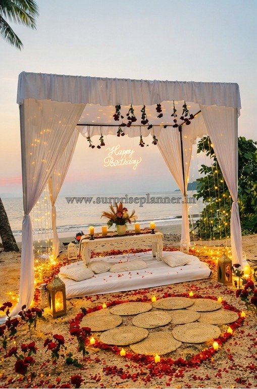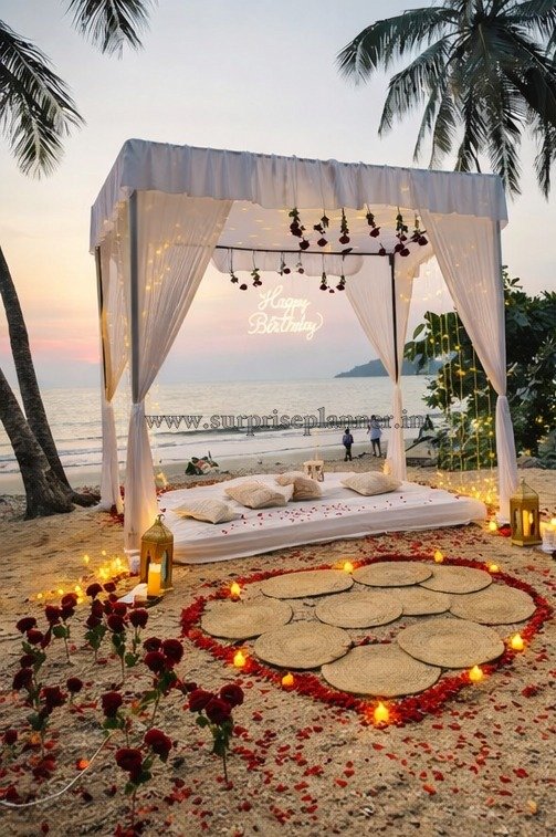 At Surprise Planner, we specialize in luxury beach proposal planning in Goa, offering customized cabana décor, romantic candlelight setups, live musicians, photography, and complete surprise coordination. Whether you want a sunset proposal or a magical evening celebration by the sea, our team ensures every detail is designed to perfection.