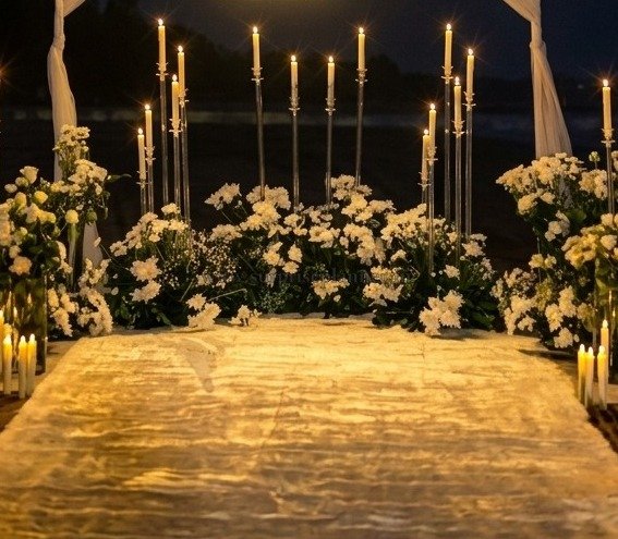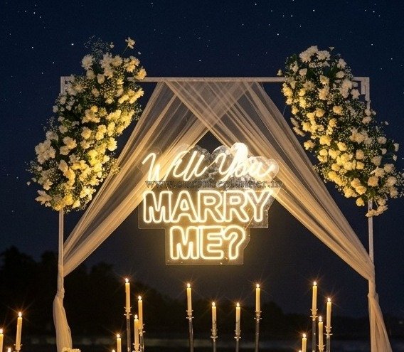 A stunning “Will You Marry Me?” neon sign becomes the highlight of the décor, perfectly placed to create a picture-perfect proposal moment. The pathway leading to the cabana is beautifully lined with glowing candles, adding a romantic and cinematic touch to your special evening. Fresh white flowers and decorative elements enhance the charm, creating a luxurious yet intimate vibe.