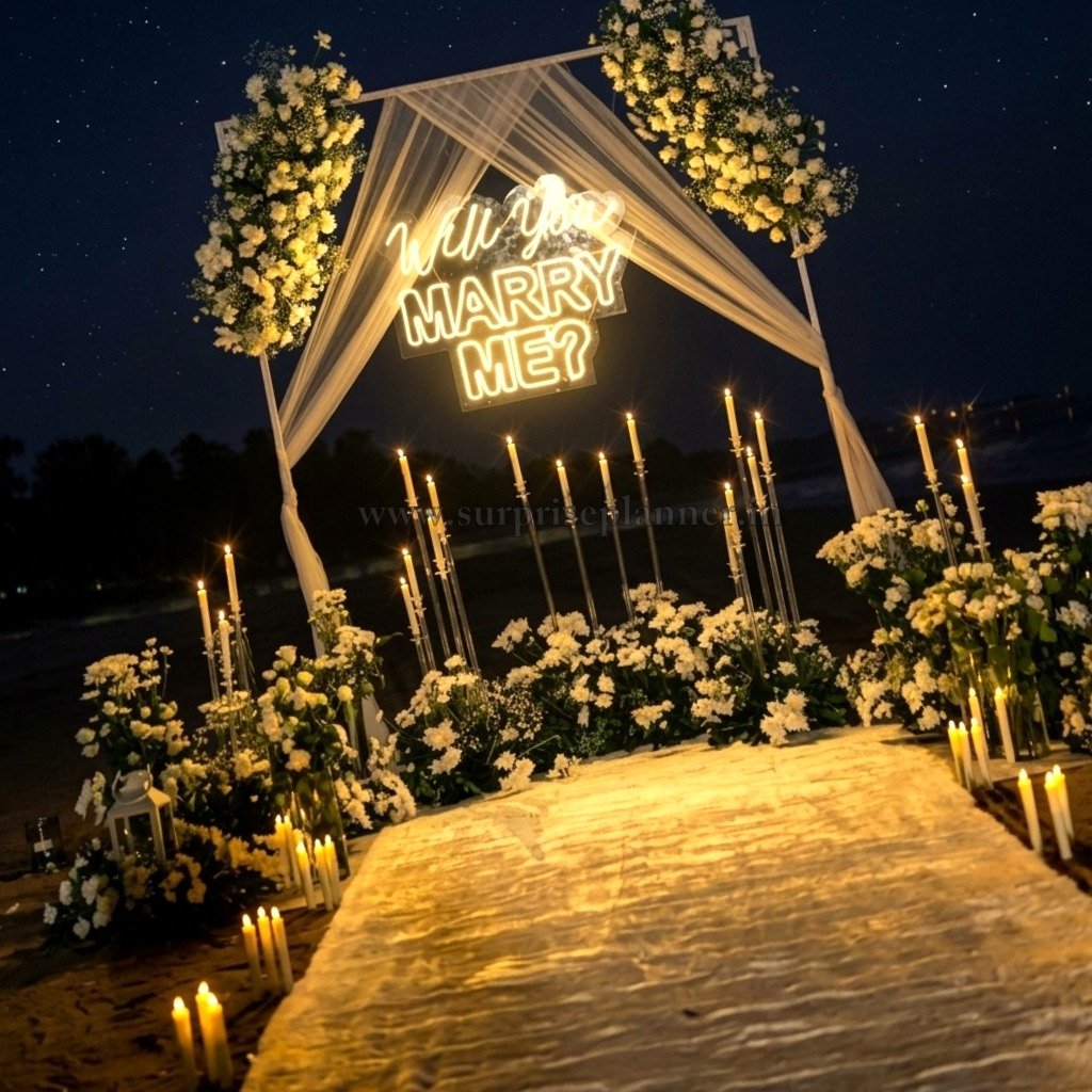 This setup is ideal for those who want to plan a grand, heartfelt proposal in a private and scenic location. The sound of waves, soft candlelight, and personalized décor together create an enchanting experience that your partner will cherish forever.
