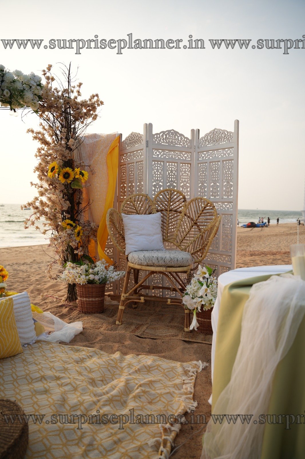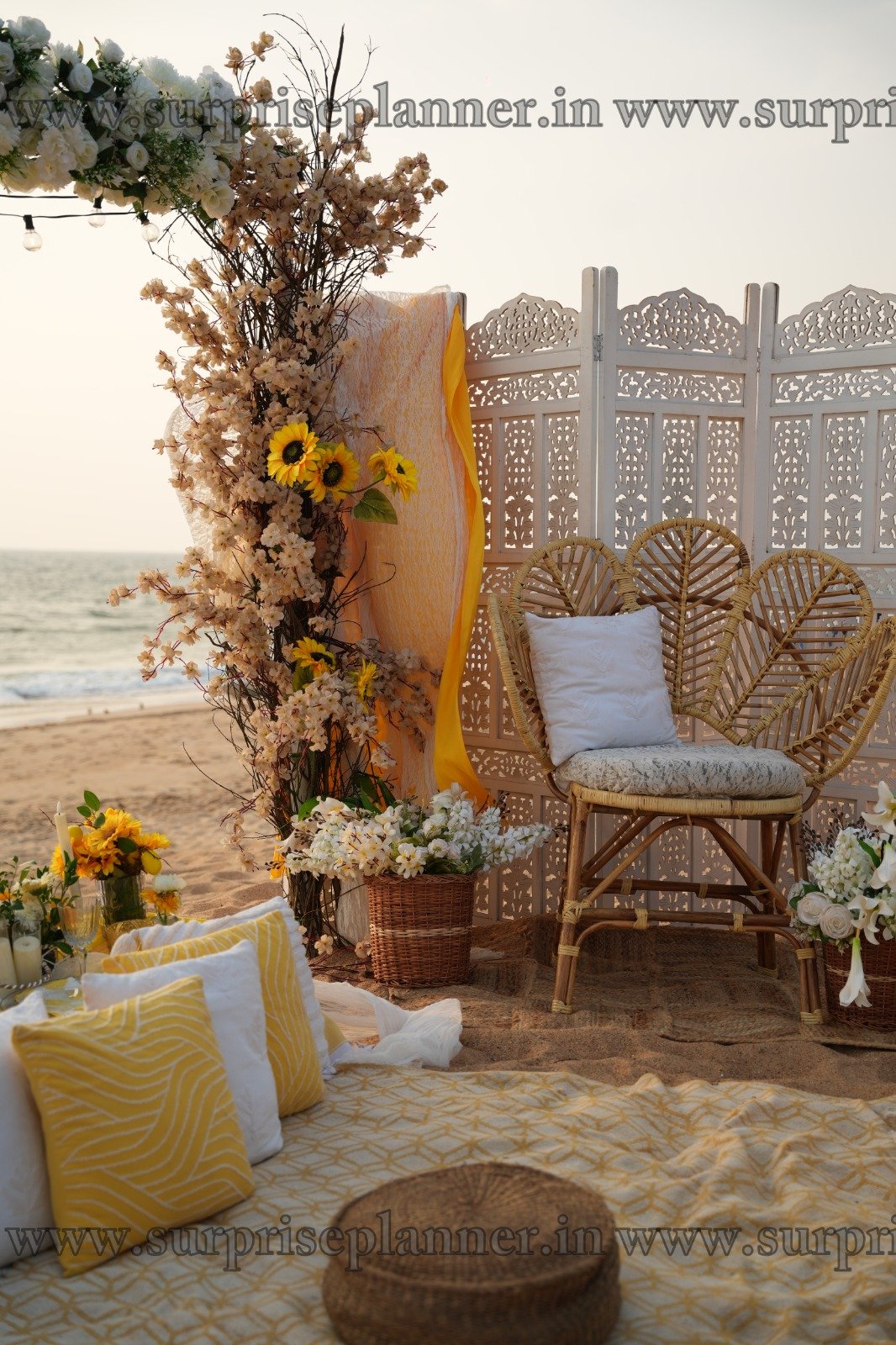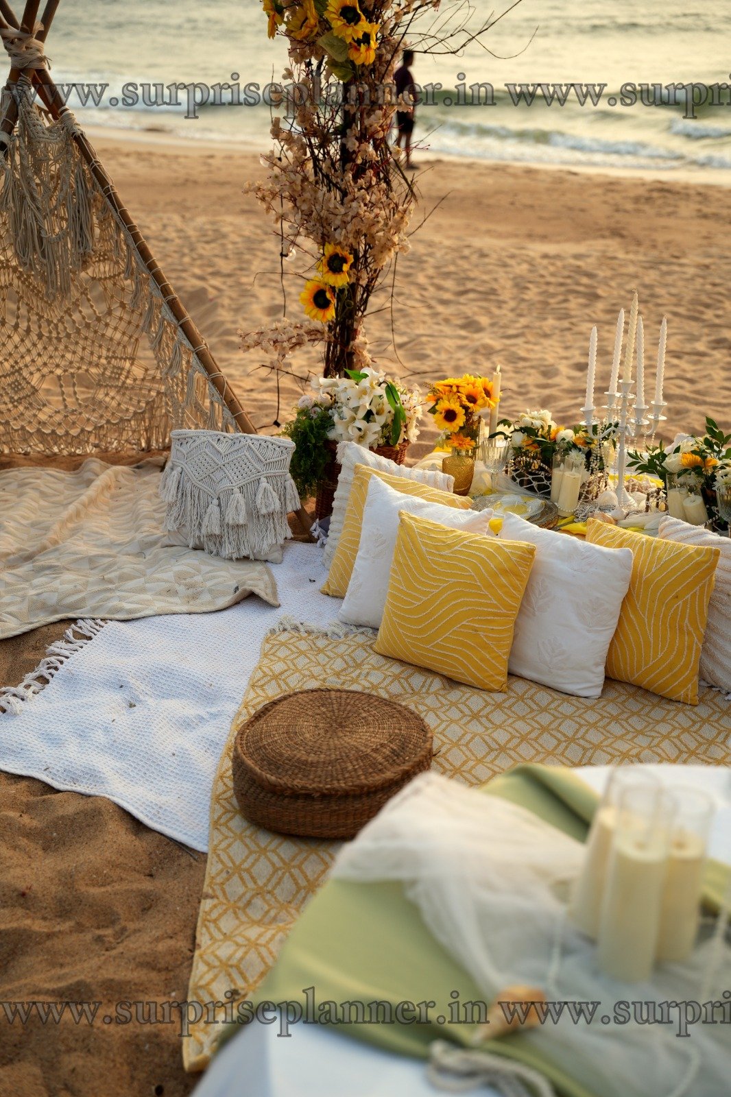 Set against the golden sands and shimmering sea, the setup features a cozy seating arrangement with white and yellow cushions, floral décor with sunflowers, a stylish macramé tent, and a delicately draped dining table. It’s the ideal spot to enjoy a private moment filled with laughter, love, and the ocean breeze.