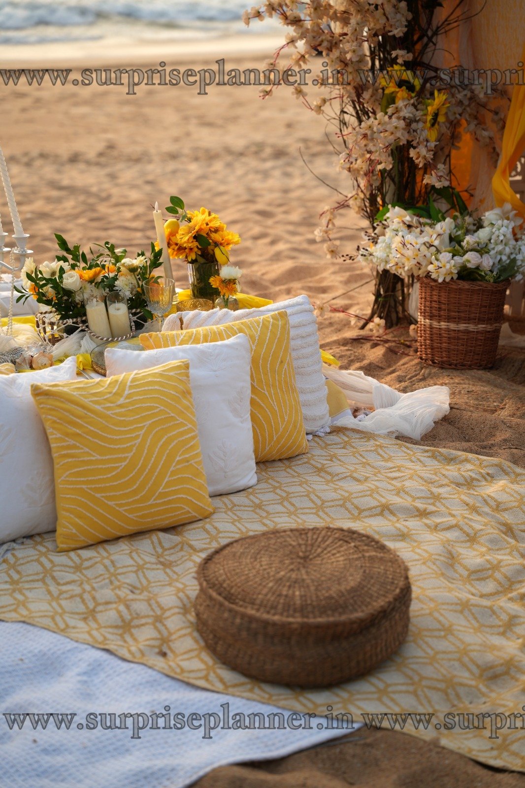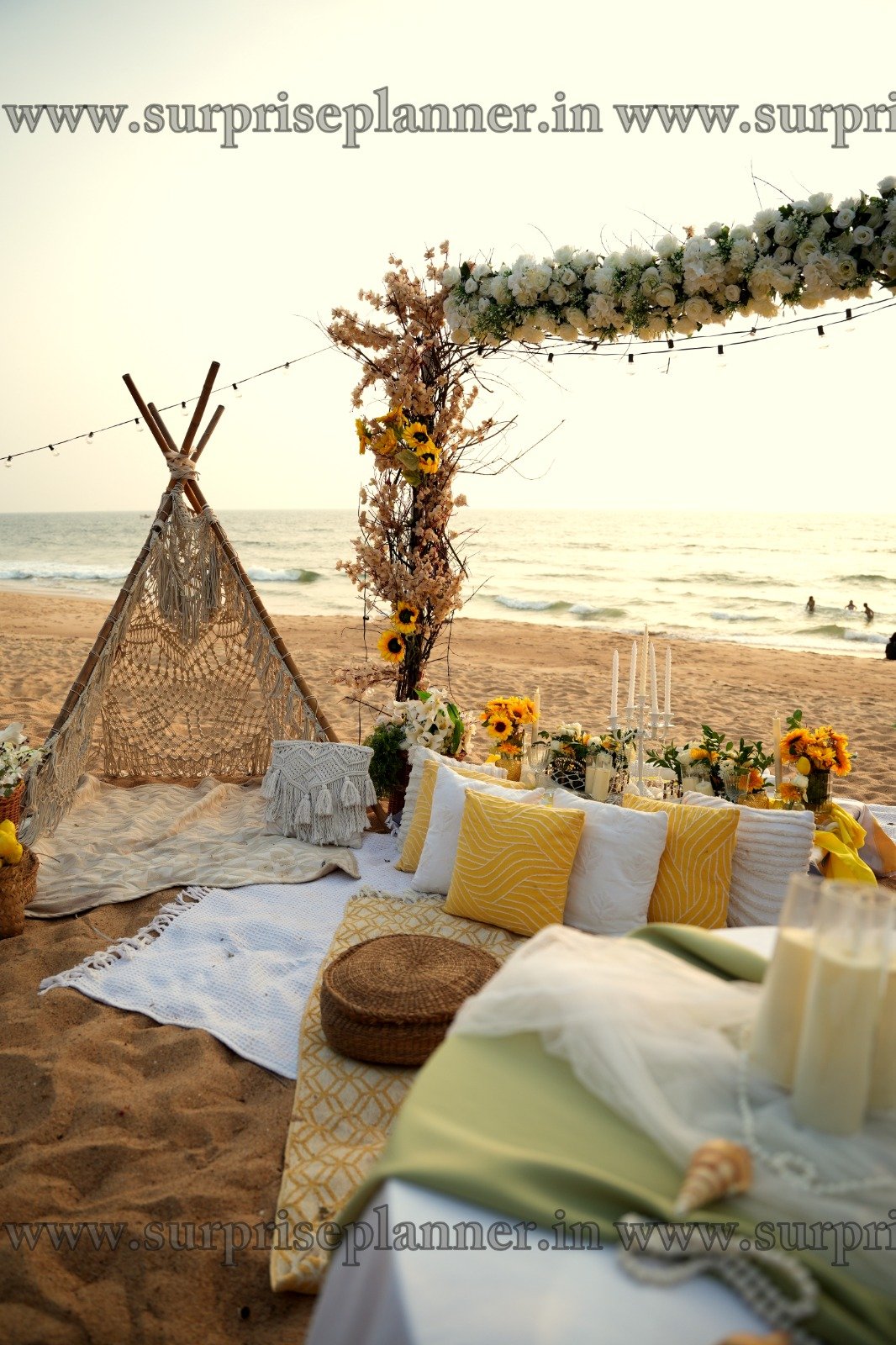 Experience the charm of a romantic beachfront picnic in Goa with our Luxury Boho Beach Setup by Surprise Planner. Designed for couples who love elegance, comfort, and the soothing sound of waves, this setup blends rustic charm with floral beauty — perfect for a sunset proposal, romantic date, or anniversary celebration.