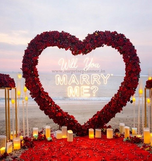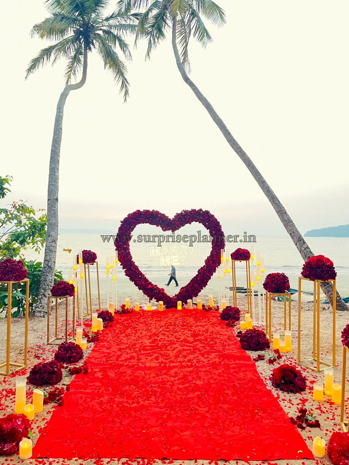 Create the perfect “Yes” moment with a breathtaking heart-shaped beach proposal setup in Goa, designed for couples who want a grand and romantic surprise. Set against the serene backdrop of Goa’s beautiful coastline and swaying palm trees, this stunning proposal décor transforms the beach into a dreamy love destination.