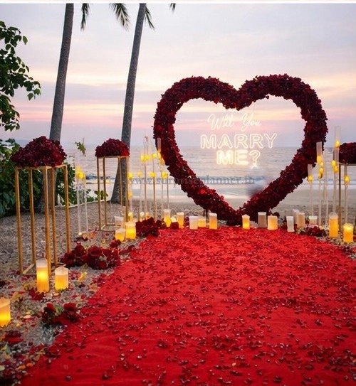 With the sound of gentle waves and the natural beauty of Goa’s tropical beach, this proposal setup offers a cinematic experience perfect for sunset proposals, surprise engagements, pre-wedding moments, and romantic celebrations. The vibrant red theme combined with candlelight and floral elegance creates an unforgettable atmosphere for asking the most important question of your life.