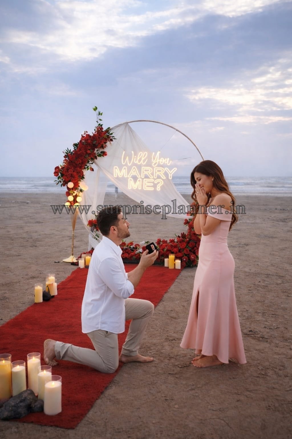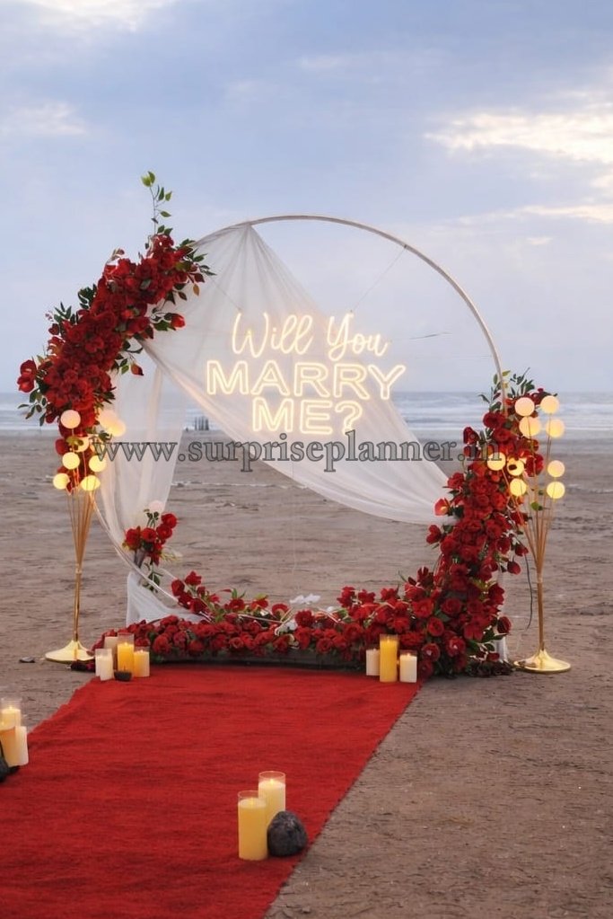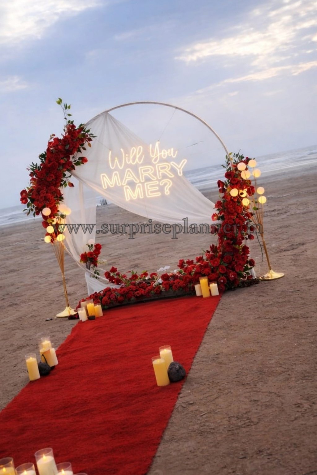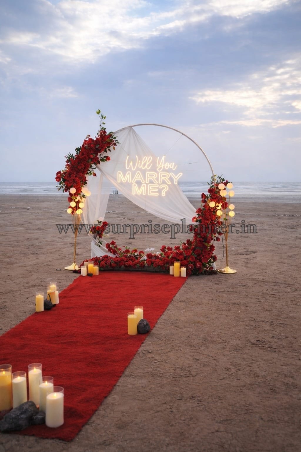 Make your proposal unforgettable with a breathtaking red rose beach setup in Alibaug. This romantic surprise proposal captures the magical moment where love meets the serene beauty of the sea. Set against the calming waves and sunset sky, the décor features a stunning circular arch adorned with rich red roses and elegant white drapes. The glowing “Will You Marry Me?” neon sign creates a picture-perfect backdrop for your once-in-a-lifetime question.