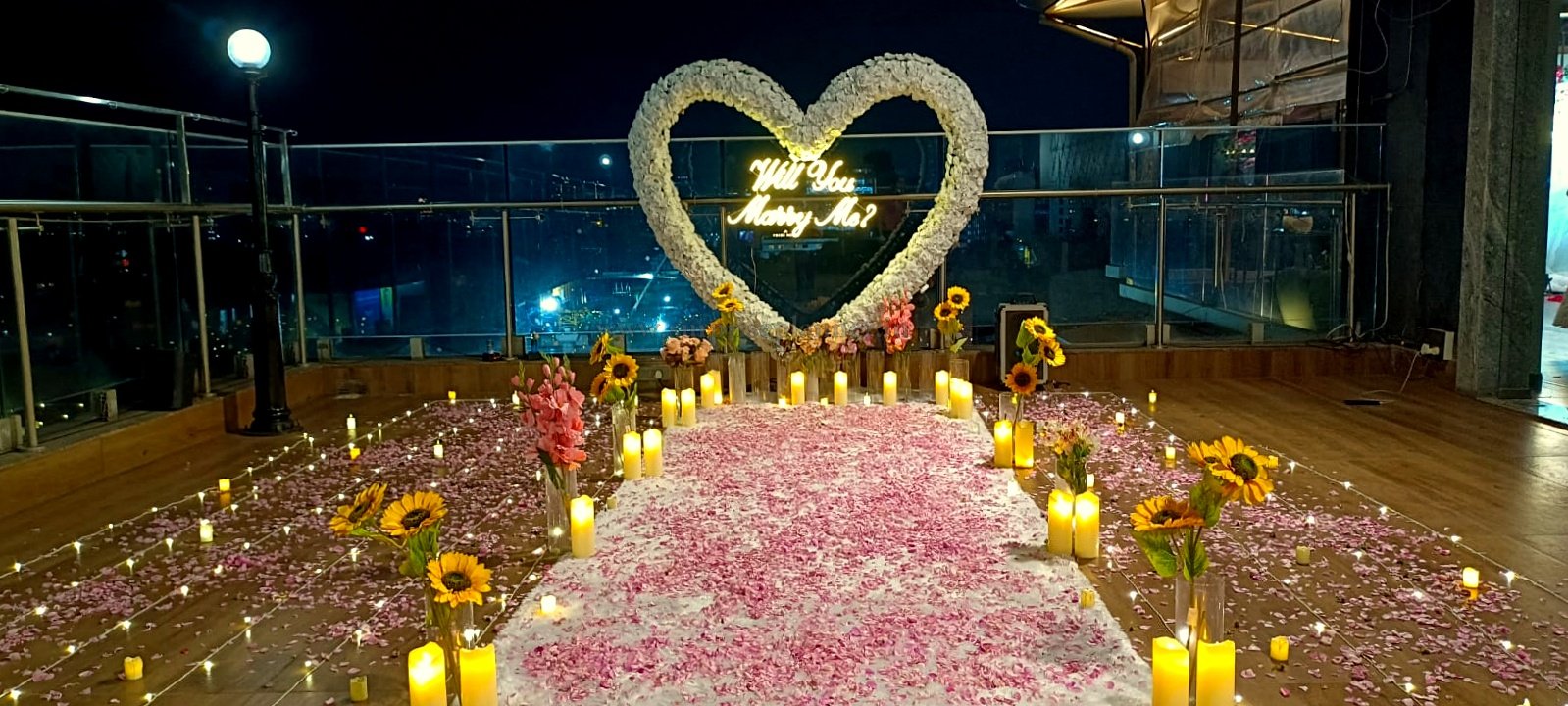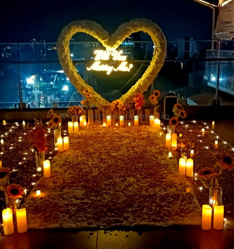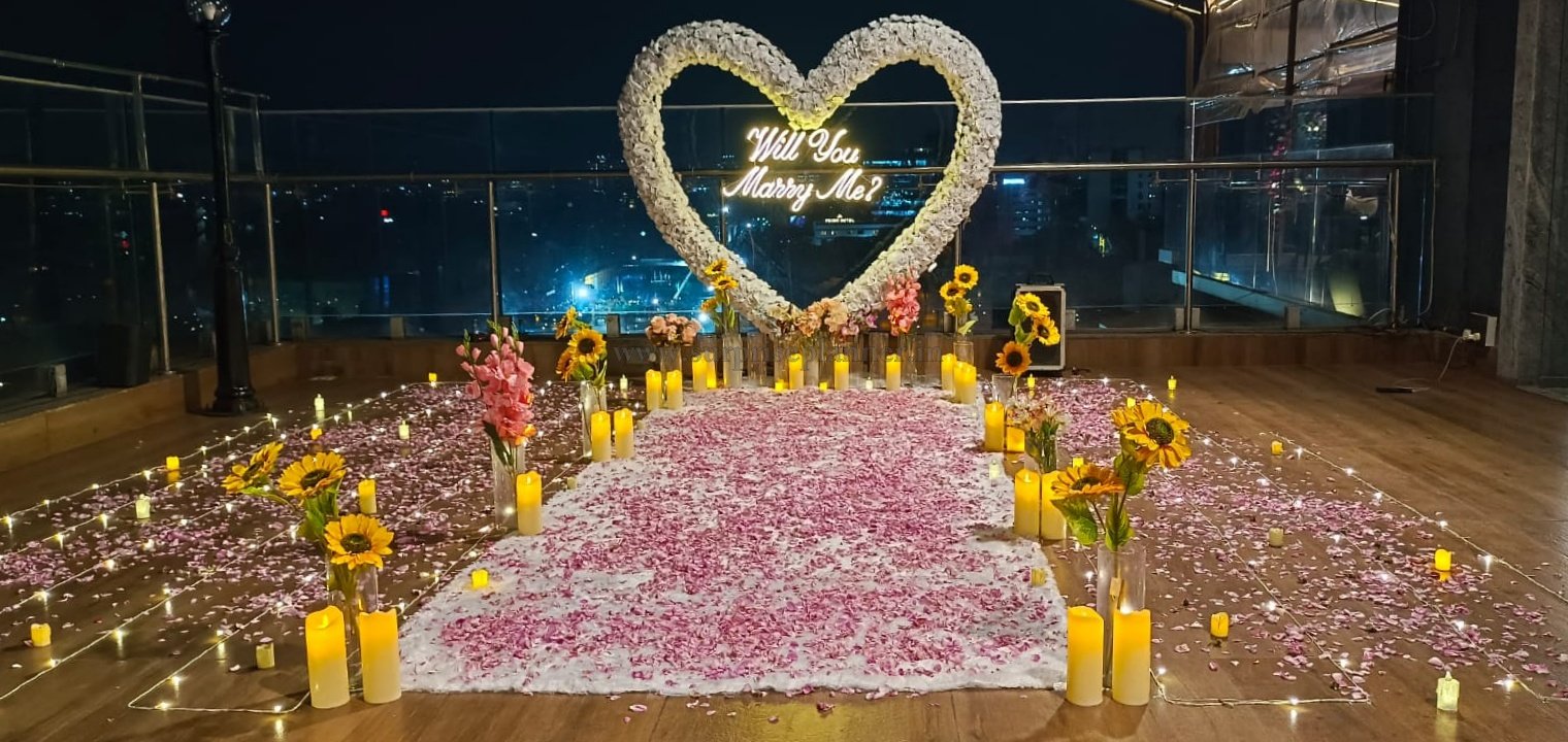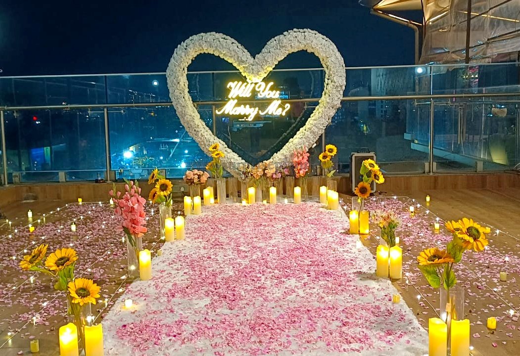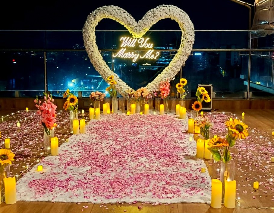 Make your proposal moment truly unforgettable with this luxury rooftop “Will You Marry Me” proposal setup in Pune, designed to create a magical and romantic atmosphere for couples. The setup features a stunning giant heart-shaped floral backdrop illuminated with a glowing neon “Will You Marry Me?” sign, creating the perfect place to pop the question.