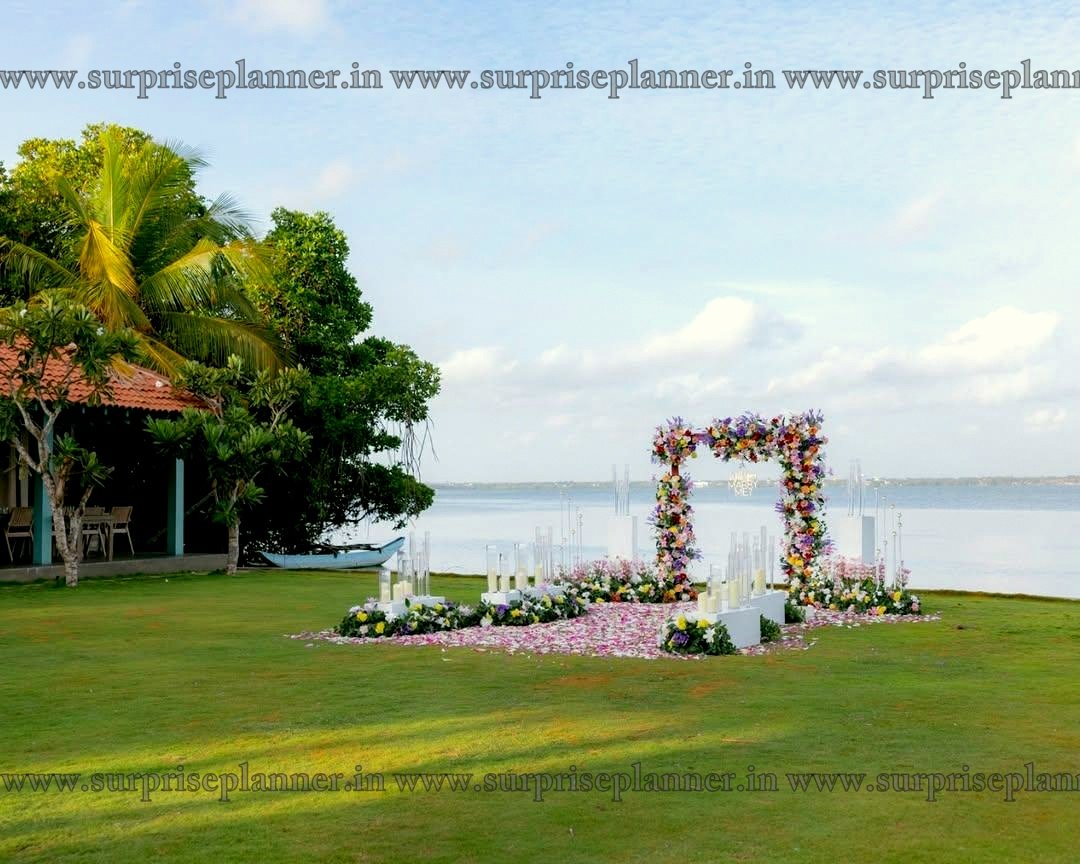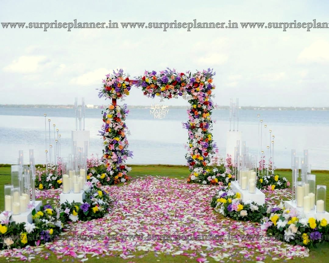 Create an unforgettable moment with our romantic lakeside proposal setup in Udaipur by Surprise Planner. This luxurious décor features a breathtaking floral arch, elegant candles, and a carpet of petals leading to the magical “Will You Marry Me” spot — all designed against the serene backdrop of Udaipur’s iconic lakes.