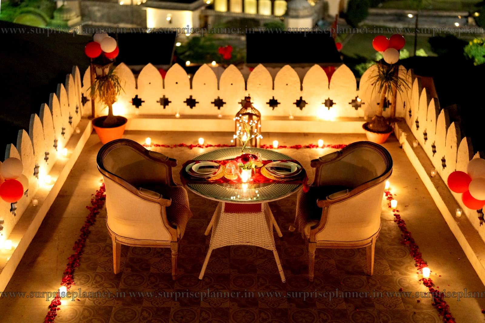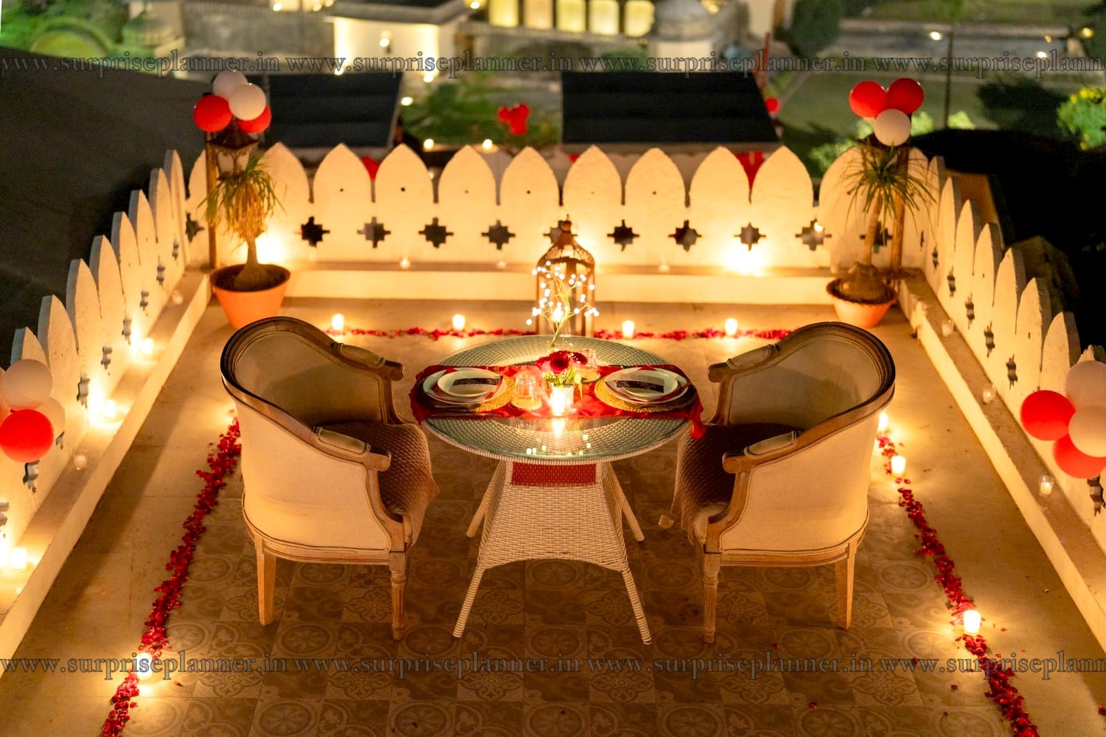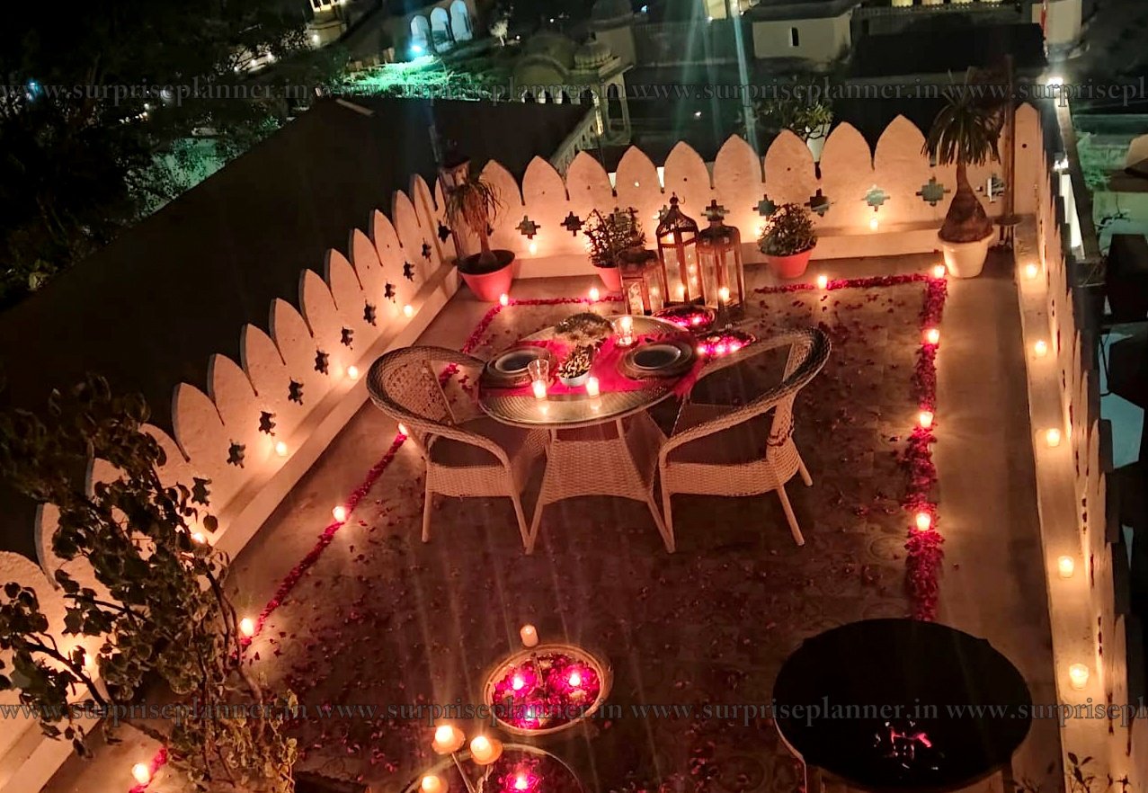 The ambiance is styled with warm candle lights, fresh rose petals, and balloon décor, creating an intimate and royal atmosphere against the backdrop of Jaipur’s heritage charm. A private rooftop seating arrangement awaits you, with a cozy round table decorated with elegant tableware, lanterns, and fairy lights to set the mood.
