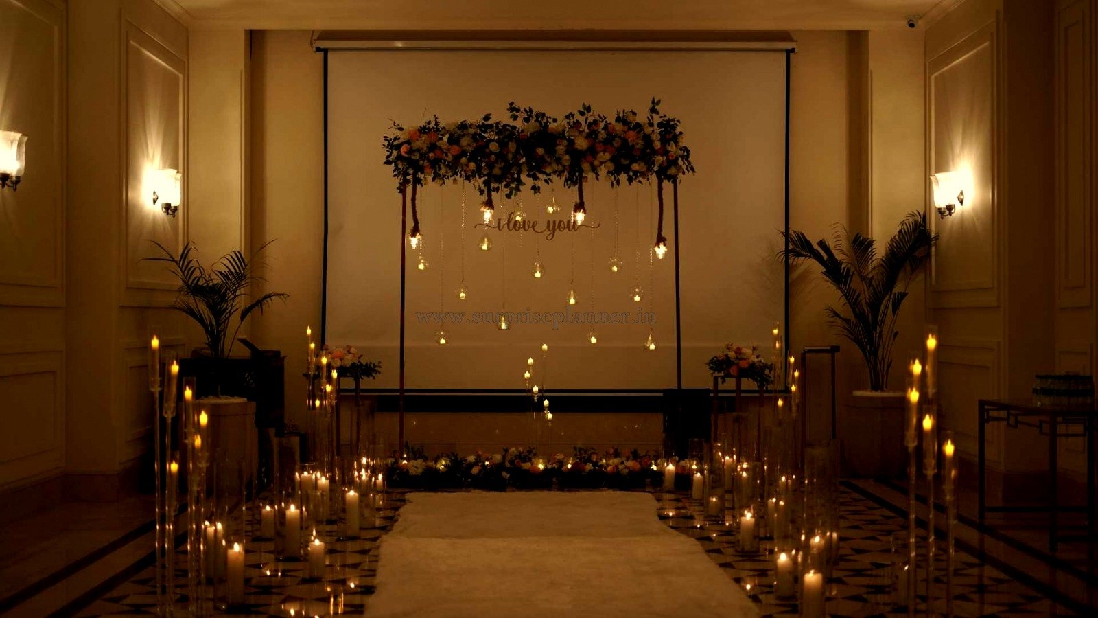 This elegant indoor setup is designed with a romantic white aisle pathway, warm candlelight décor, hanging Edison bulbs, and a beautiful floral canopy backdrop that creates a dreamy atmosphere for your once-in-a-lifetime moment. The setup is perfect for a surprise proposal, offering a sophisticated and private celebration space with a royal touch.