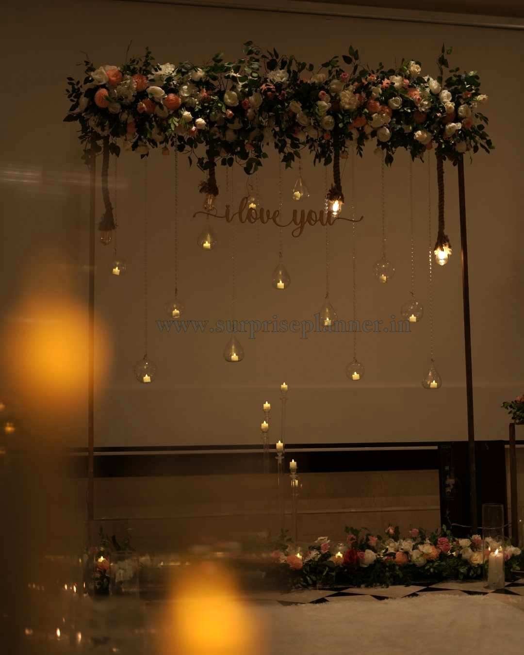 The décor features a grand floral frame, delicately suspended lights, premium candles placed artistically along the aisle, and a romantic backdrop centerpiece that enhances the emotional charm of your special day. Whether you want a heartfelt “Will You Marry Me?” moment or a private luxury proposal celebration, this setup delivers an experience filled with elegance and emotion.