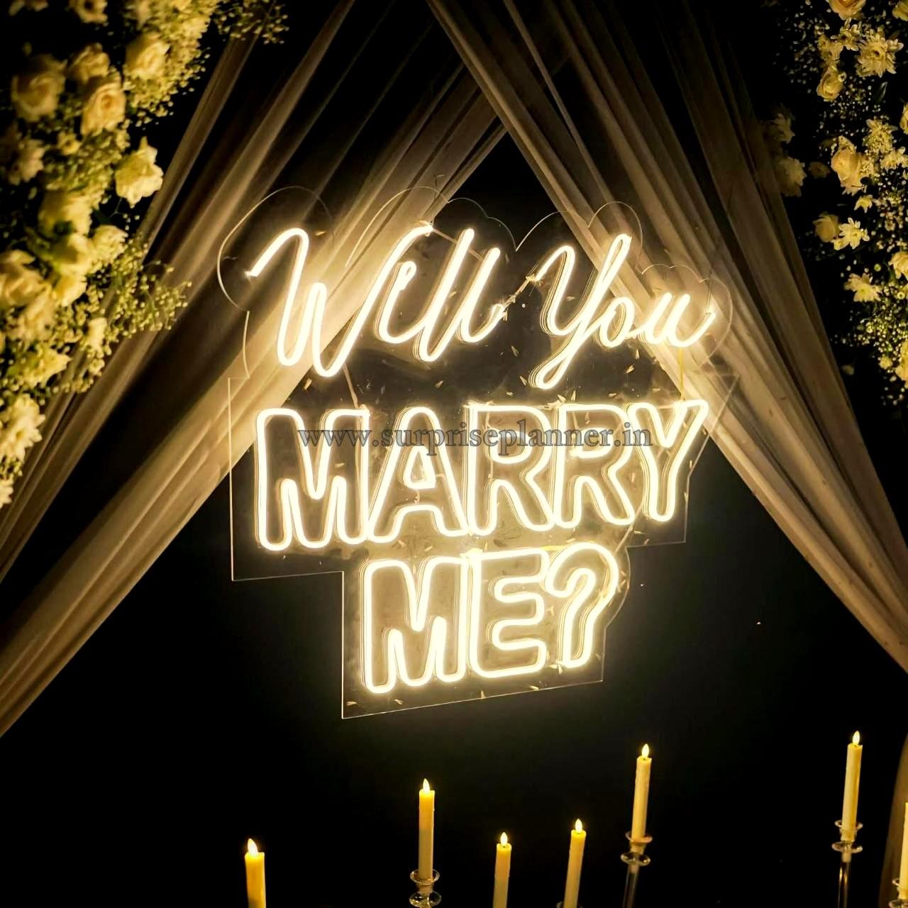 The décor features an elegant cabana draped in sheer white fabric, beautifully accented with fresh floral arrangements that exude sophistication and romance. At the center, a glowing “Will You Marry Me?” neon sign creates a captivating focal point, making your proposal moment truly picture-perfect. The pathway leading to the cabana is lined with candles and decorative elements, creating a dreamy entrance that enhances the emotional build-up.