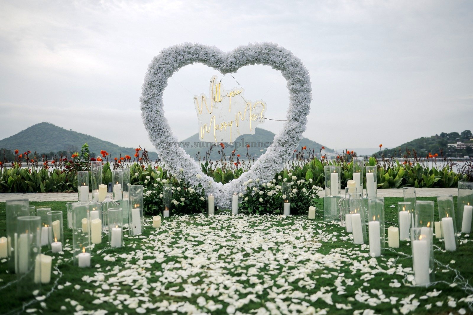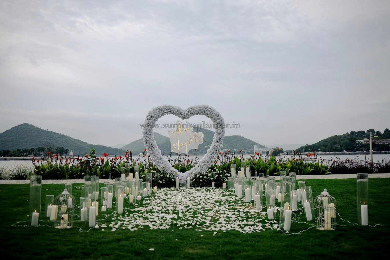 Turn your dream proposal into a cinematic love story with our Royal Sparkle Heart Proposal Experience in Udaipur. Set against the breathtaking backdrop of serene lakes and Aravalli hills, this setup is designed to create a magical “yes” moment you’ll cherish forever.