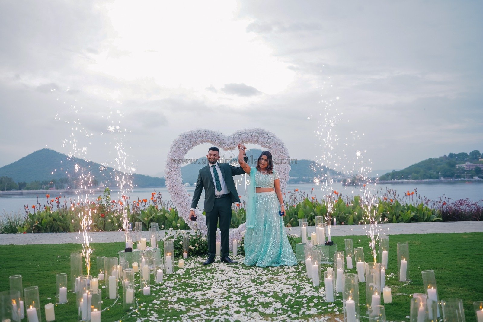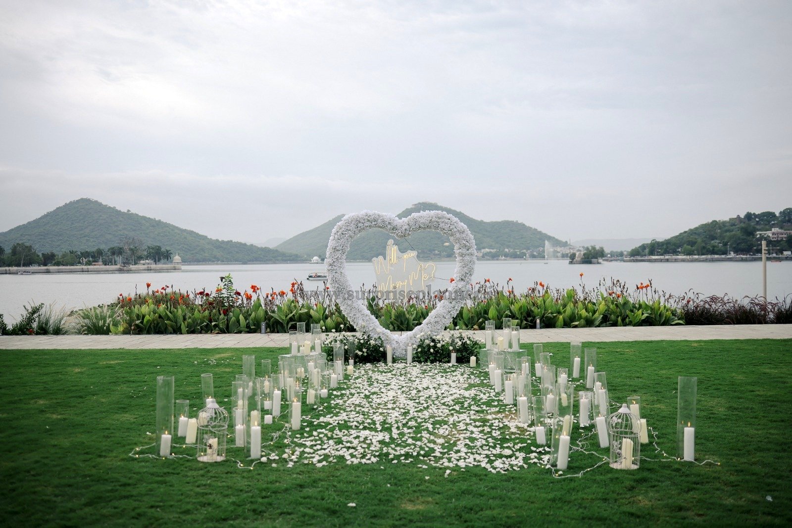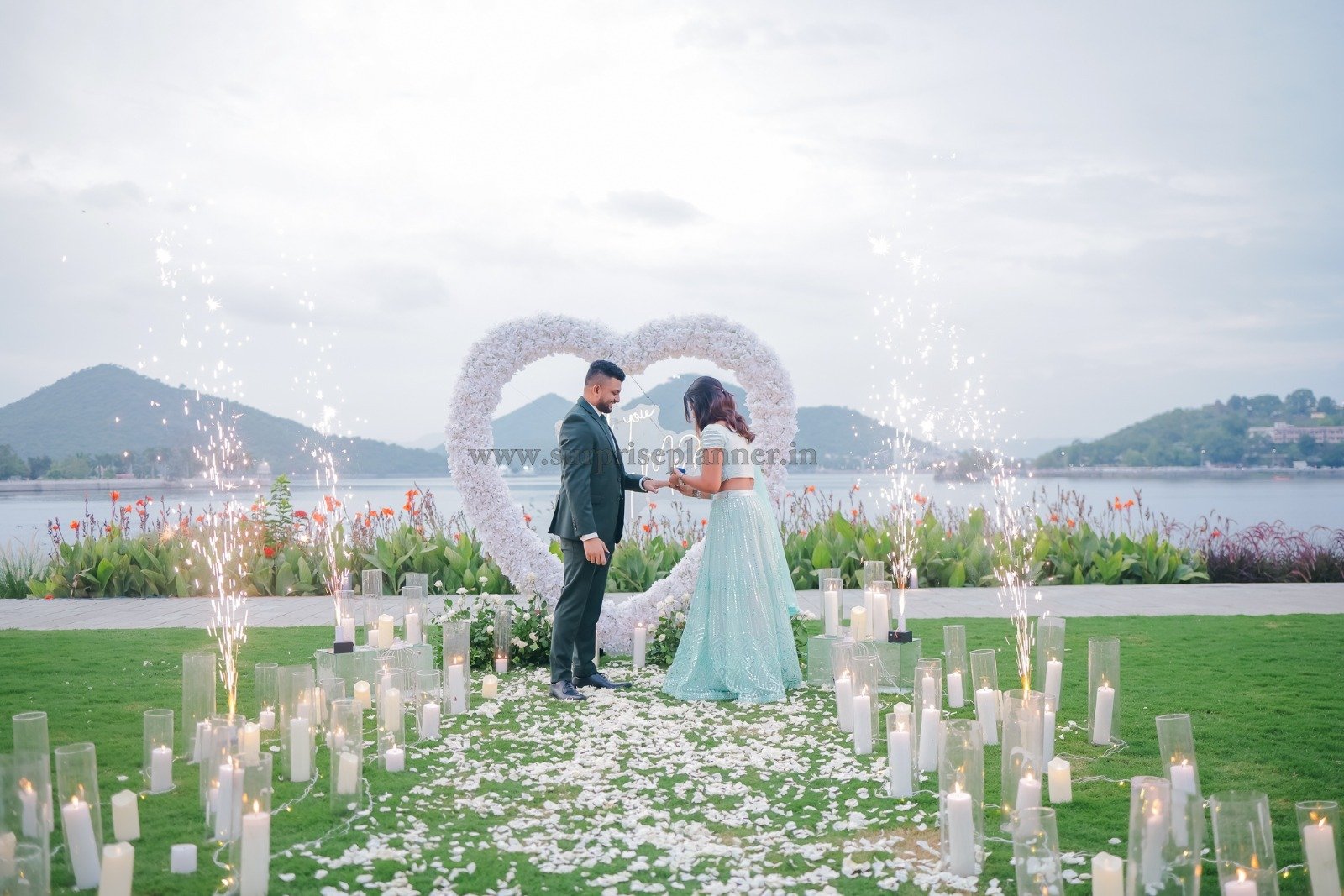 To elevate the experience, cold pyrotechnic sparkles (safe fireworks) light up the moment as you go down on one knee, adding a grand, celebratory touch. The entire setup is enhanced with soft floral arrangements, ambient lighting, and a luxurious outdoor setting that captures the charm of Udaipur’s royal vibe.