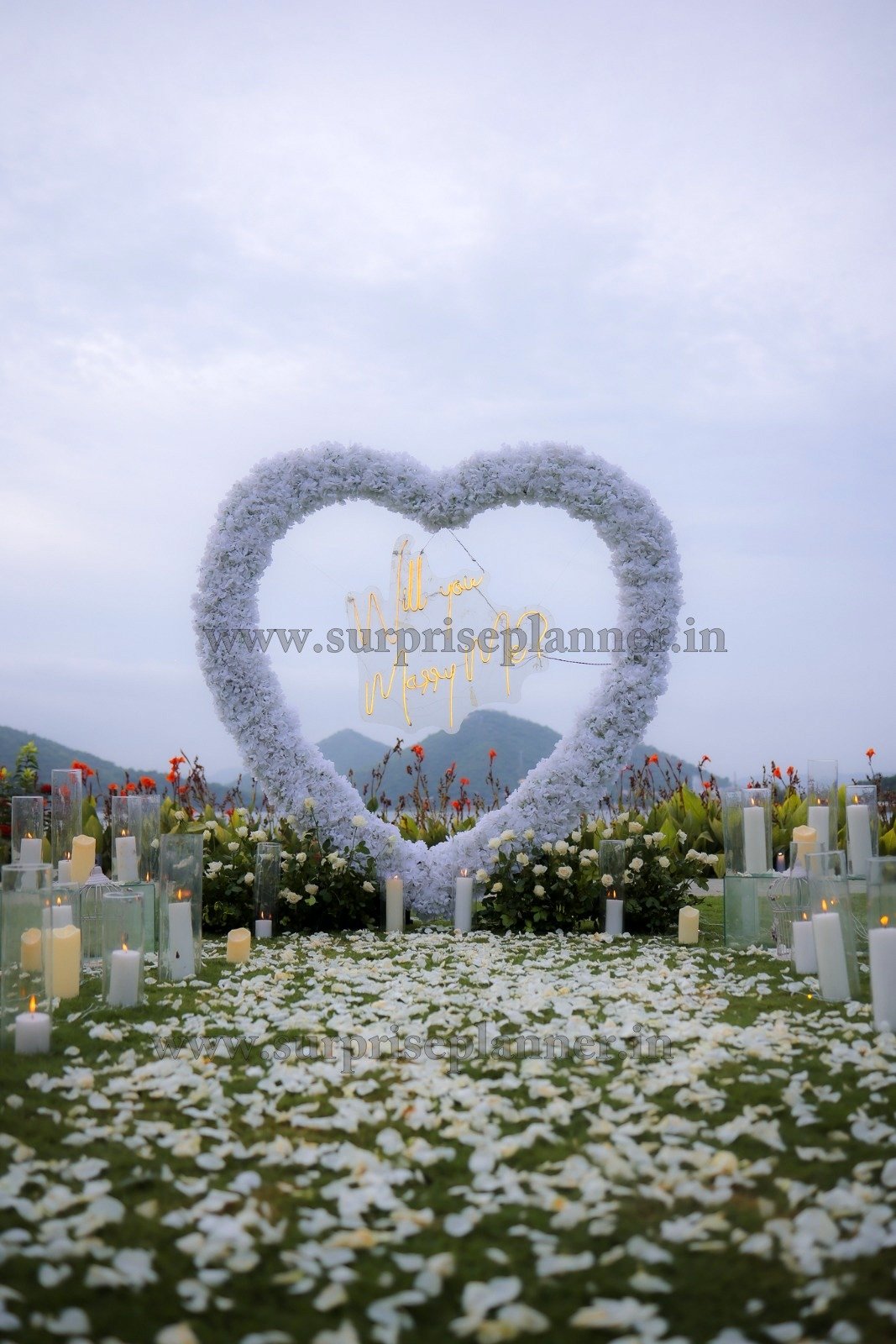 The highlight of this experience is a stunning heart-shaped floral backdrop, beautifully crafted with elegant white blooms, symbolizing purity and everlasting love. The pathway leading to the proposal spot is adorned with delicate flower petals and surrounded by premium glass candle stands, creating a glowing aisle that sets the perfect romantic mood.