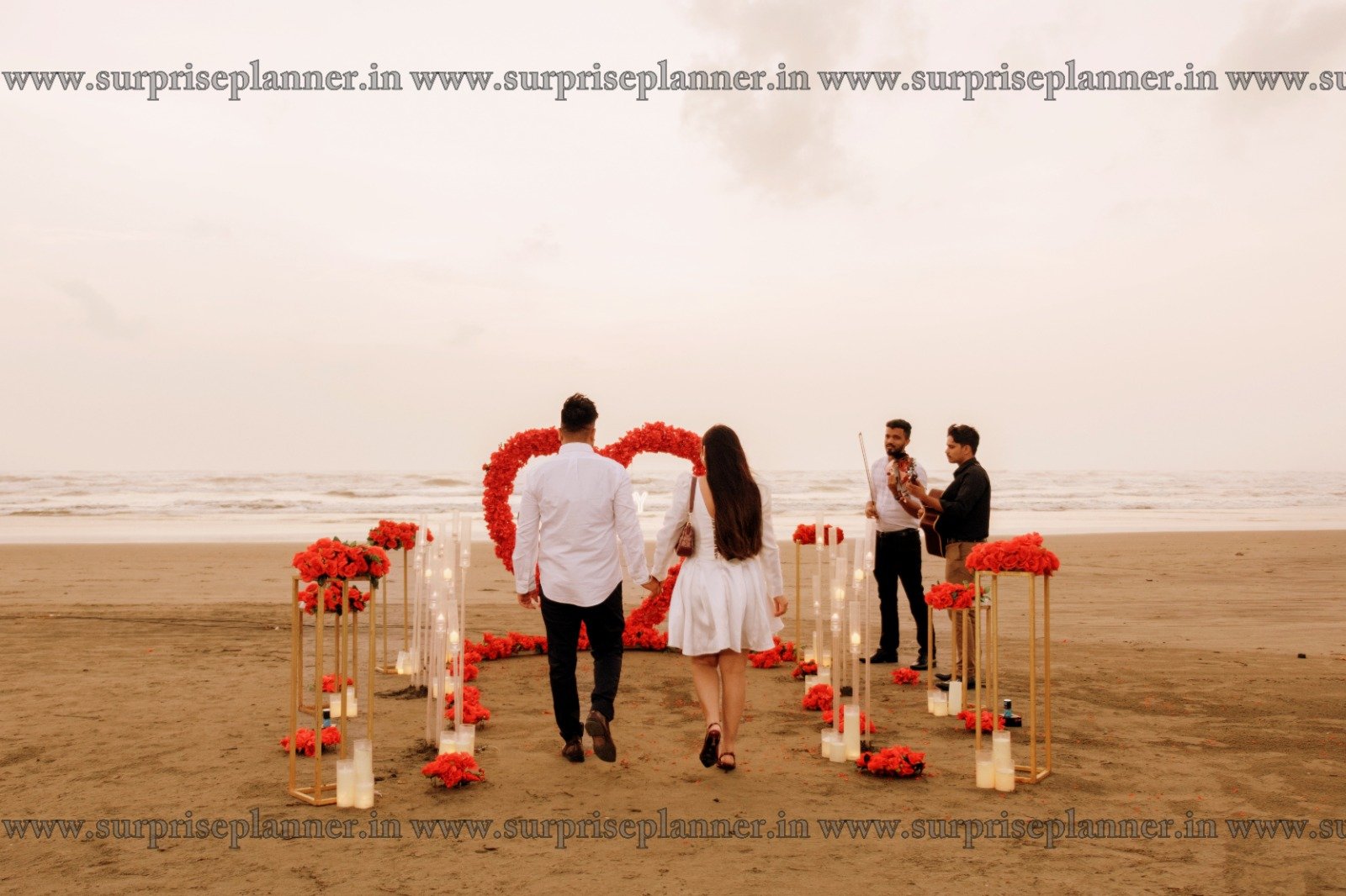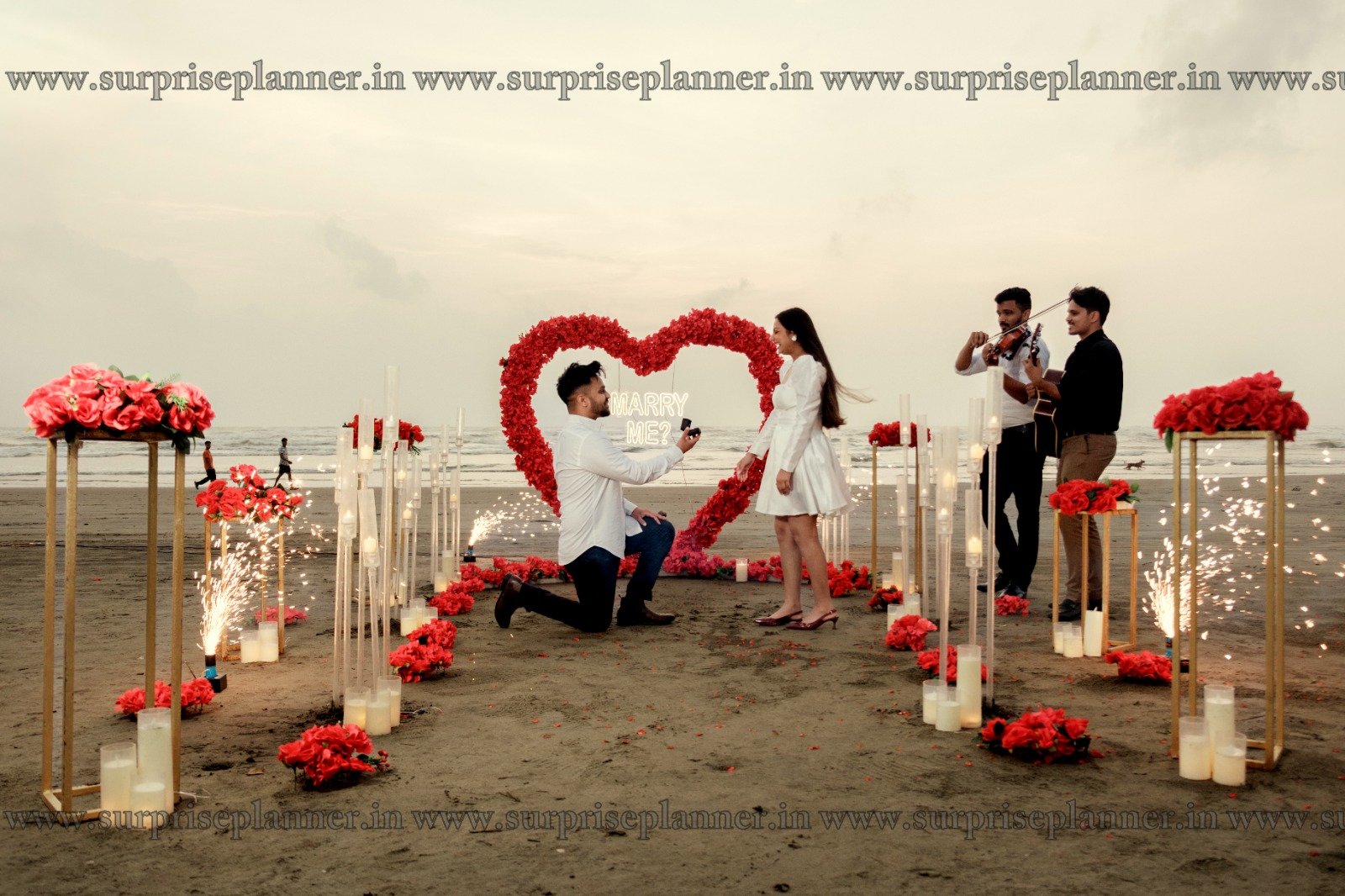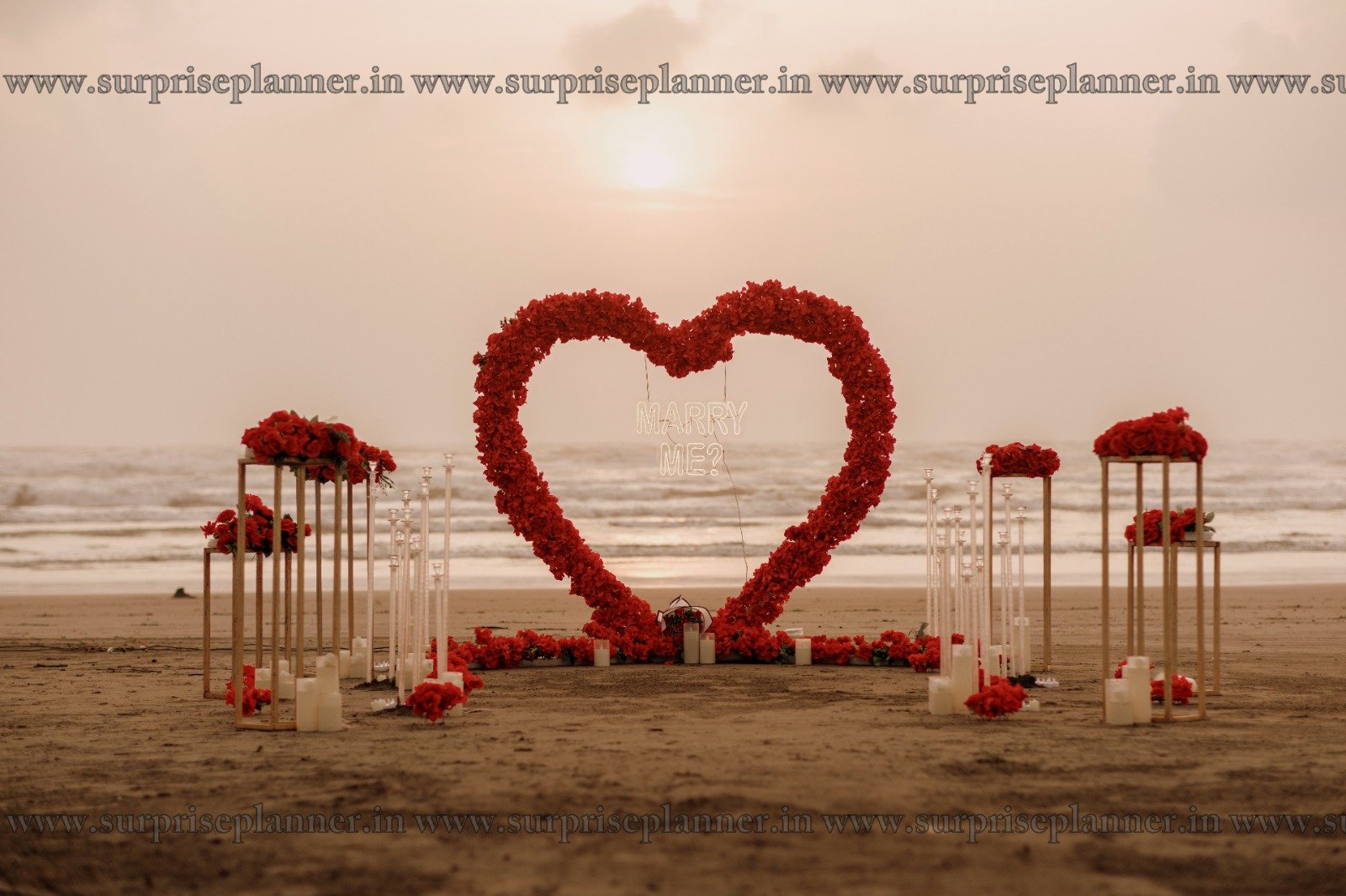 Make your dream proposal come to life with this breathtaking beachside “Will You Marry Me?” setup in Goa by Surprise Planner. As the sun sets over the shimmering waves, a magical moment unfolds — a red floral heart arch glowing with “Marry Me?” lights, candle-lit pathway, and soft music playing in the background.